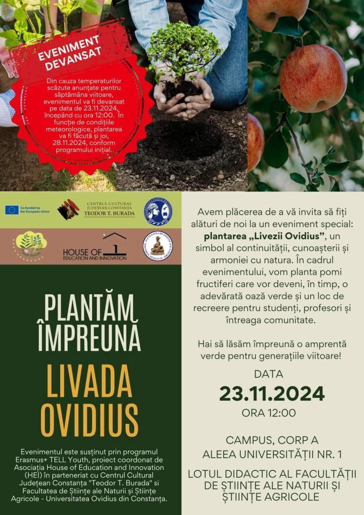 After the successful tree-planting activity as part of the Erasmus+ Tell Youth project, the Ovidius Orchard is now taking root and thriving! Thanks to the dedication of 130 participants, we planted 125 fruit trees and 75 grapevines on November 23 and 28. This initiative not only contributed to environmental sustainability but also laid the foundation for an innovative space that combines science, culture, and art.
