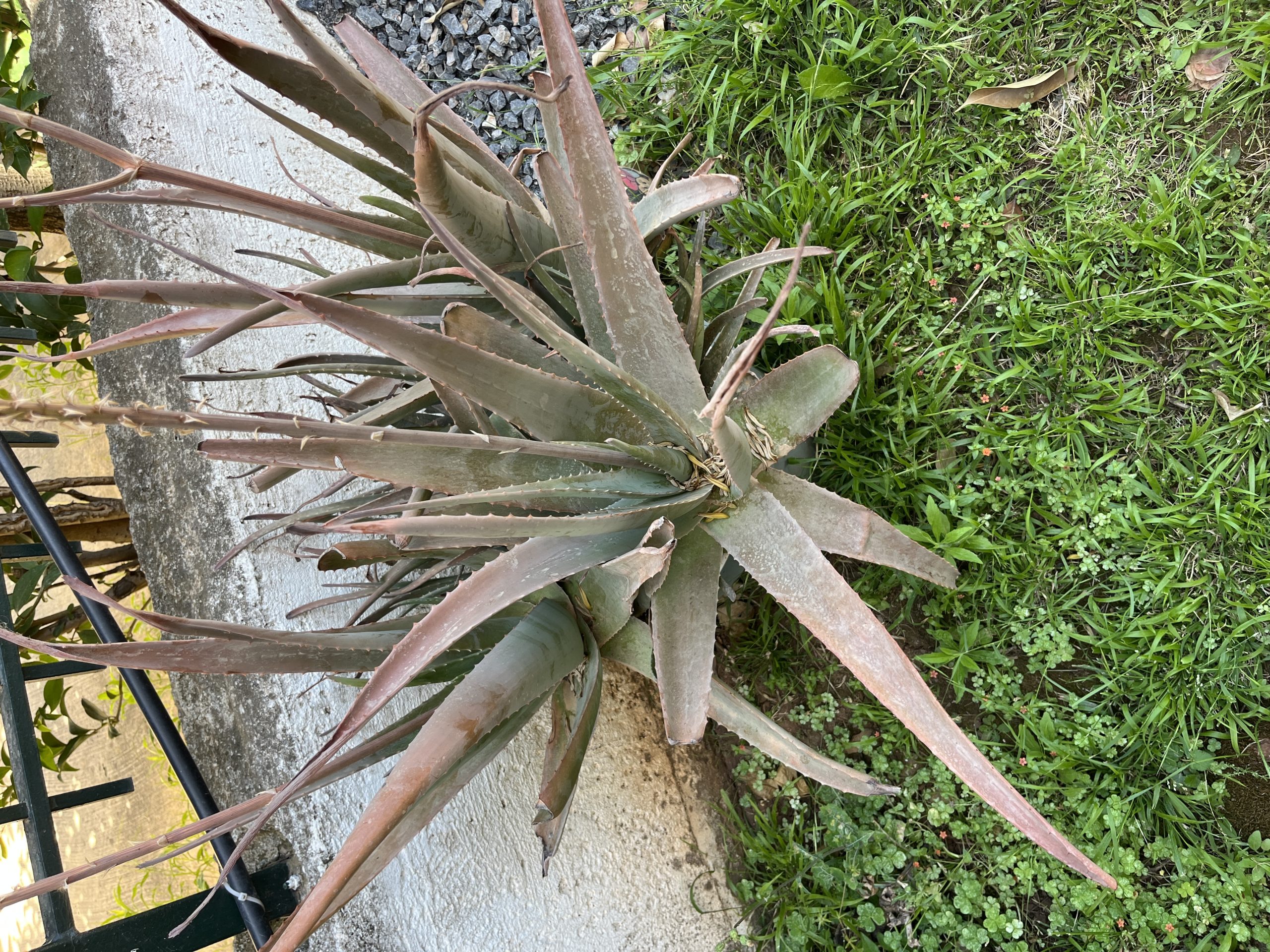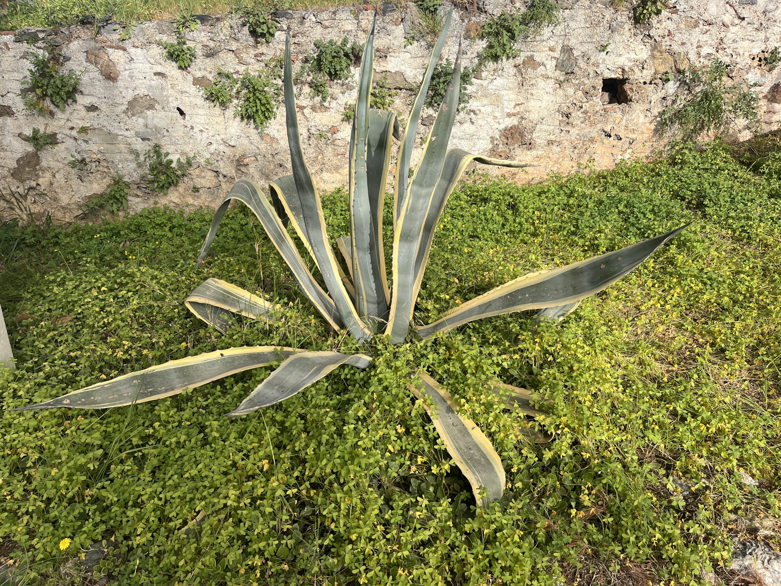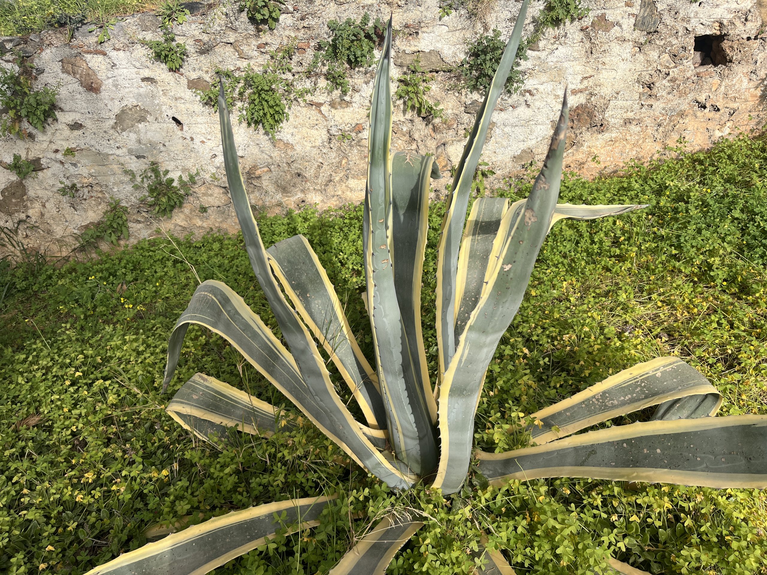 Agave americana is a large, rosette-forming succulent with thick, fleshy, gray-green or variegated leaves that can grow up to 1.5–2 meters long. Each leaf ends in a sharp spine and has spiny margins. The plant is known for its dramatic flowering event, which happens only once (monocarpic), typically after 10–30 years, producing a tall flower stalk (up to 8 meters) before dying.