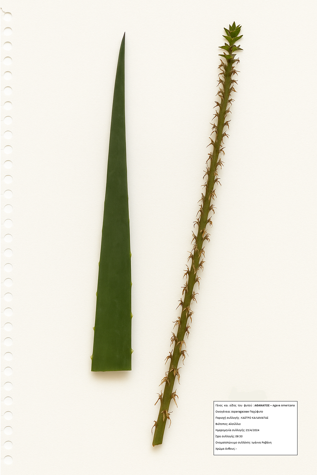 Μεγάλο παχύφυτο με φύλλα 1,5–2 μ. μήκος, σαρκώδη και γκριζοπράσινα ή ποικιλόχρωμα. Κάθε φύλλο έχει αγκάθι και αγκαθωτά περιθώρια. Ανθίζει μόνο μία φορά, μετά από 10–30 χρόνια, με ανθικό μίσχο έως 8 μ., και στη συνέχεια πεθαίνει.