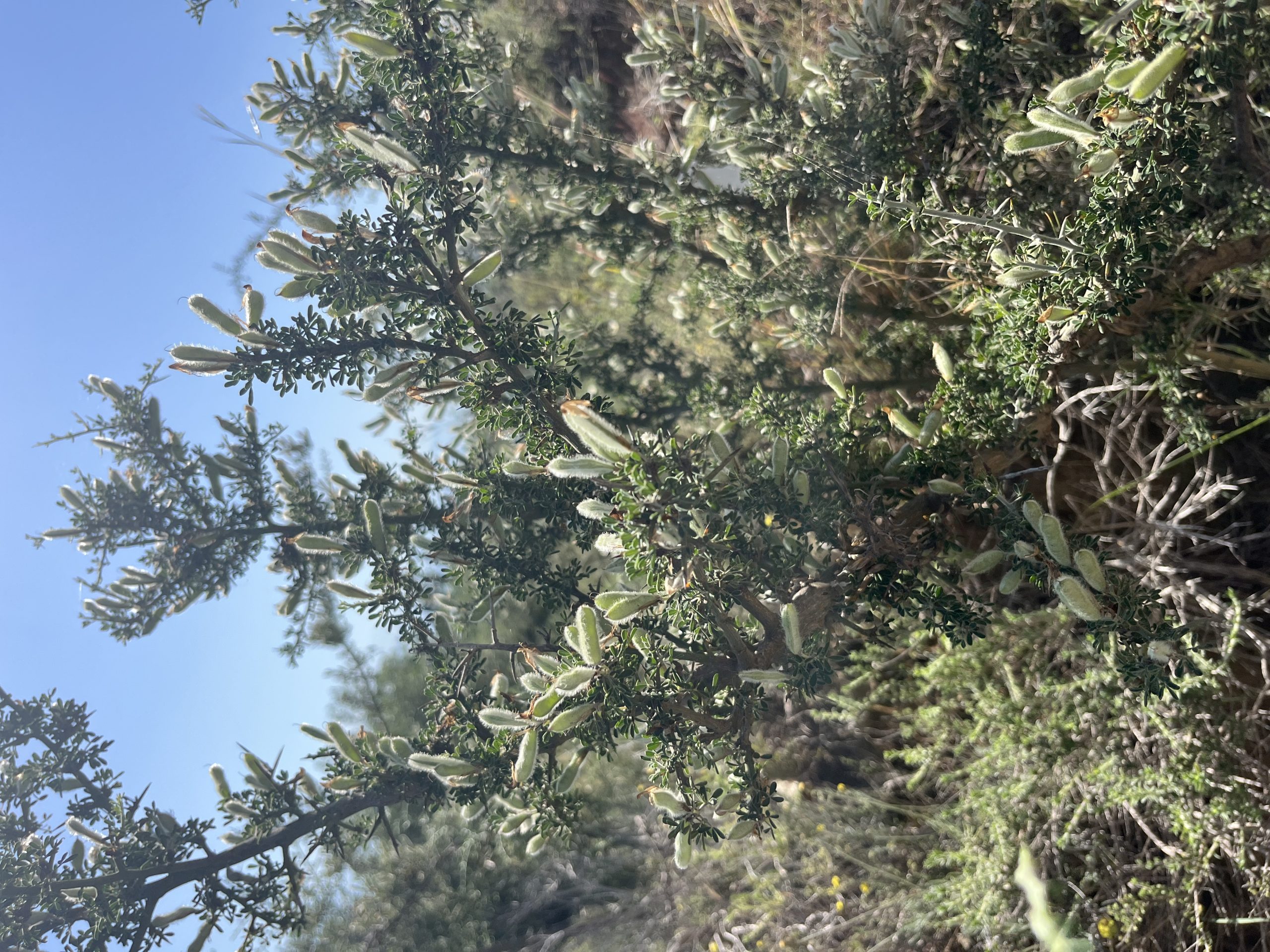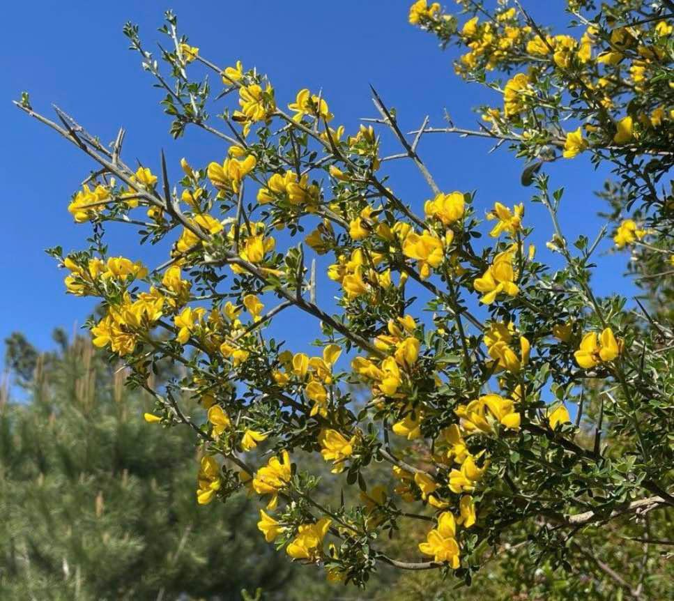 Dense, spiny shrub up to 1.5 m tall, with green, hairy stems covered in sharp thorns and small trifoliate leaves. Bright yellow, pea-like flowers bloom in spring, often densely clustered. Noted for its villose (soft-hairy) texture, especially on young stems and leaves.