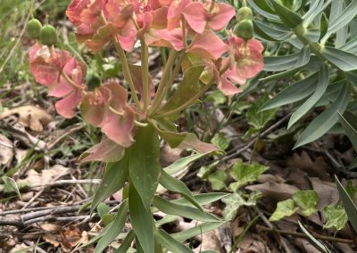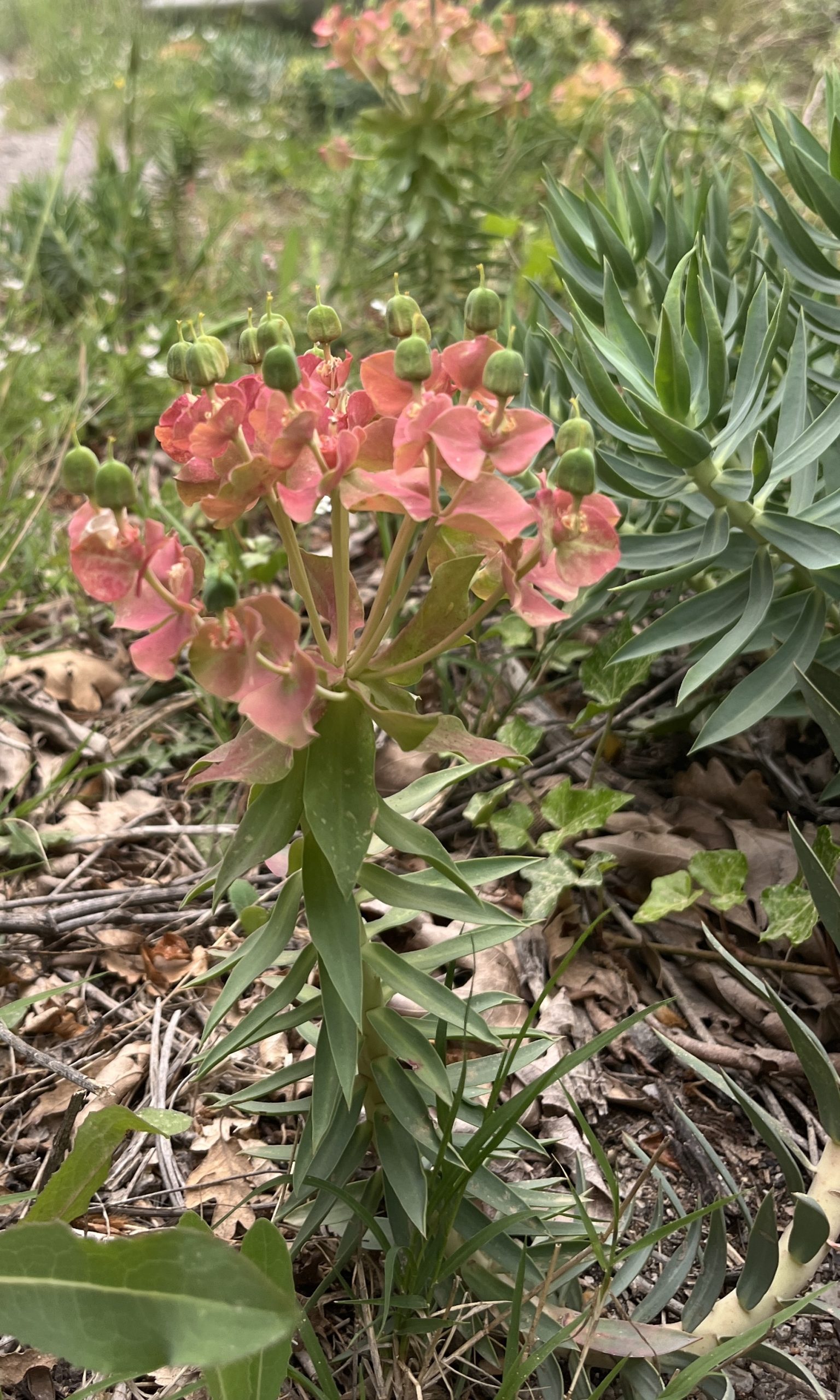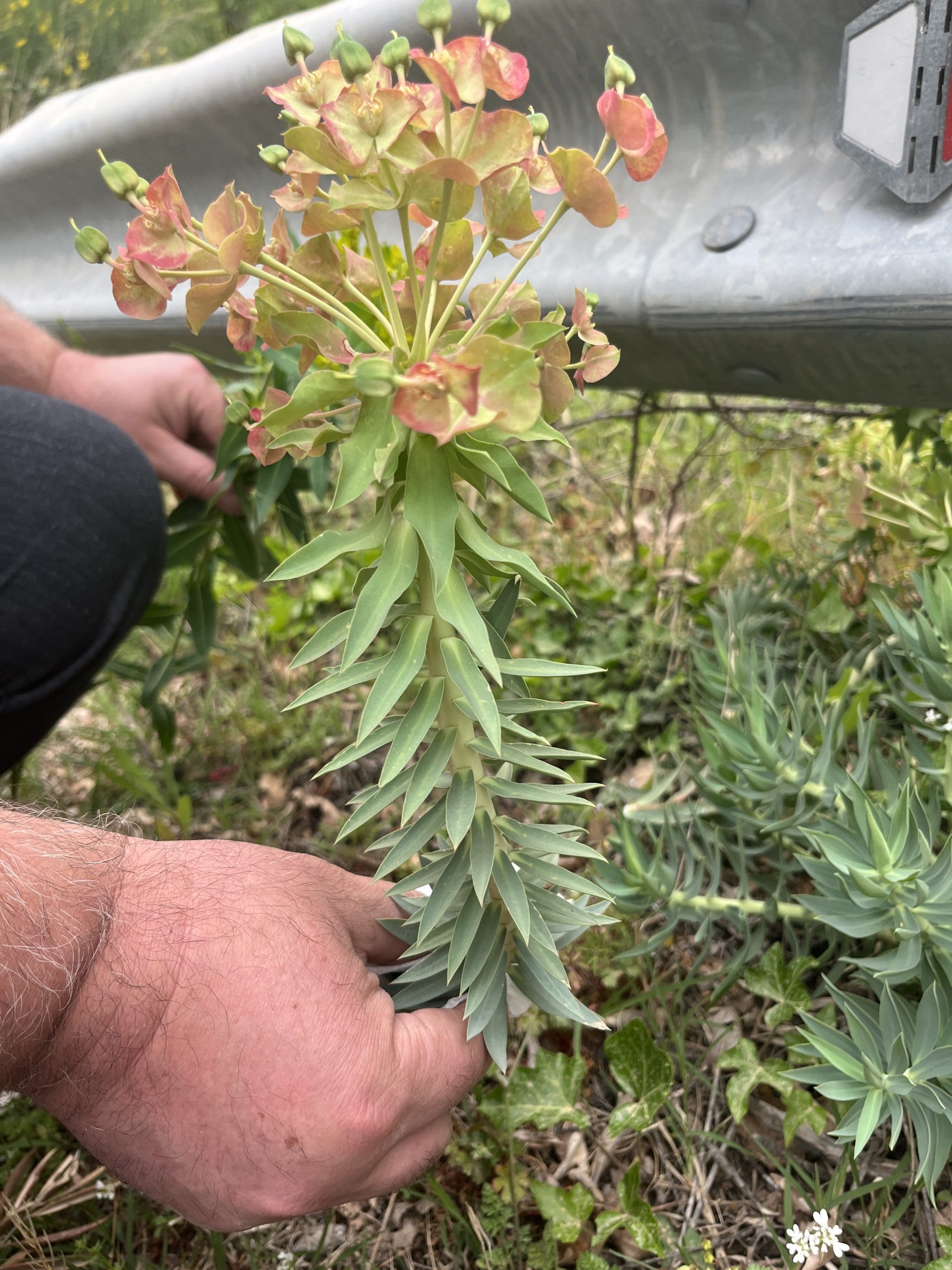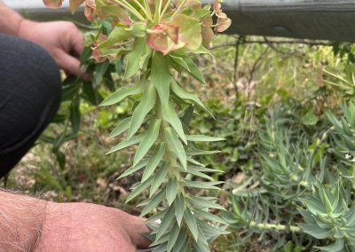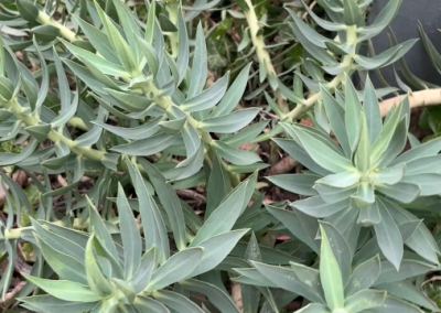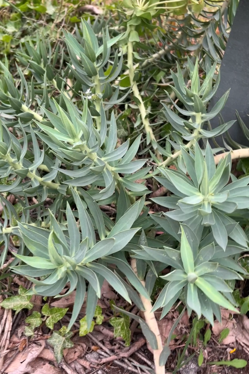 Succulent perennial herb or subshrub, 20–70 cm tall. Glaucous with upright, fleshy stems. Narrow, oblong leaves arranged spirally, smaller toward top. Greenish-yellow flowers in terminal cymes spring to late summer. Exudes milky latex when cut.