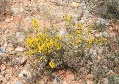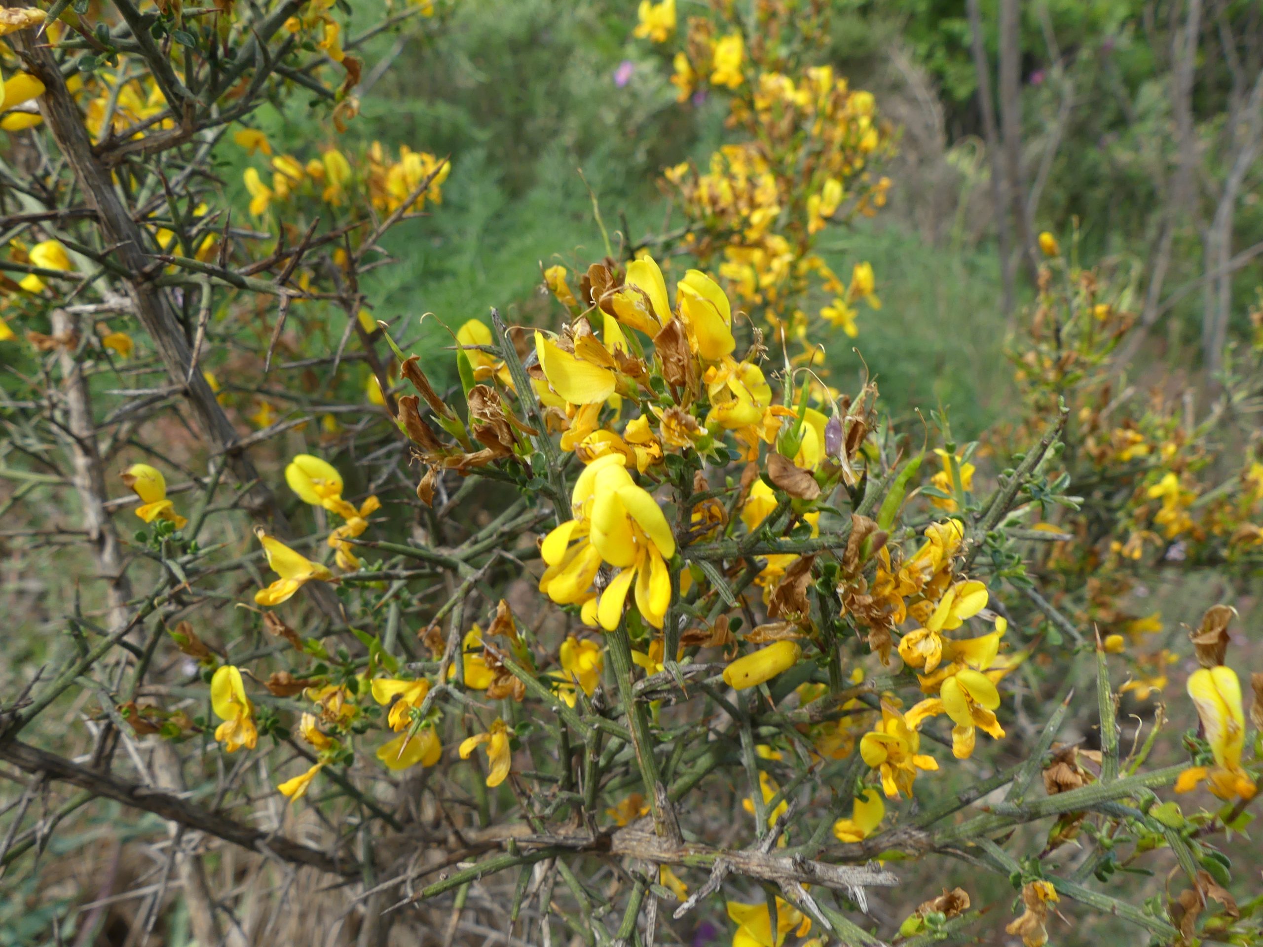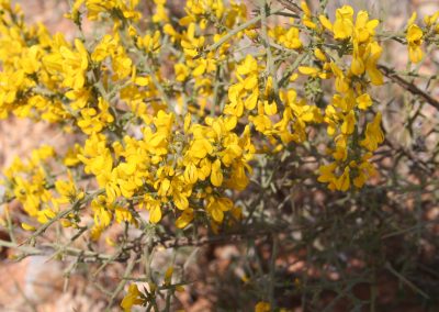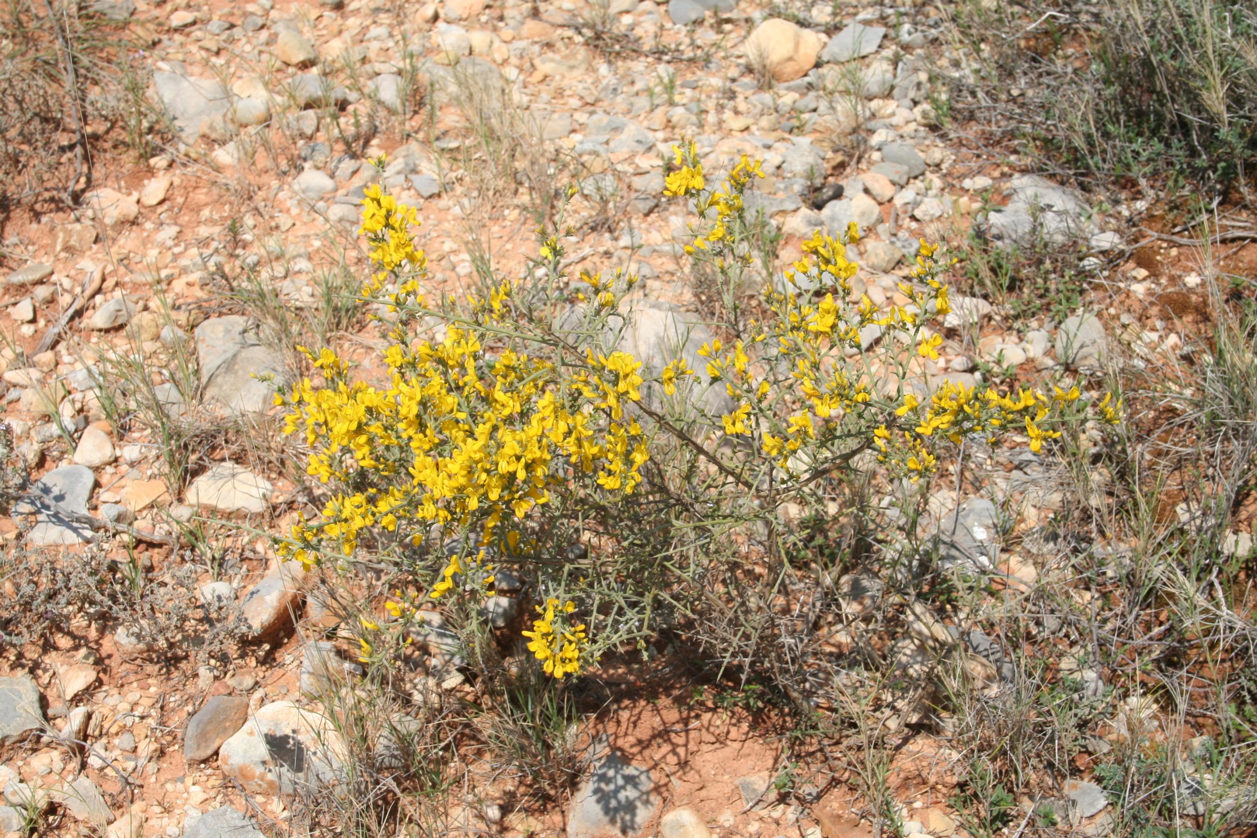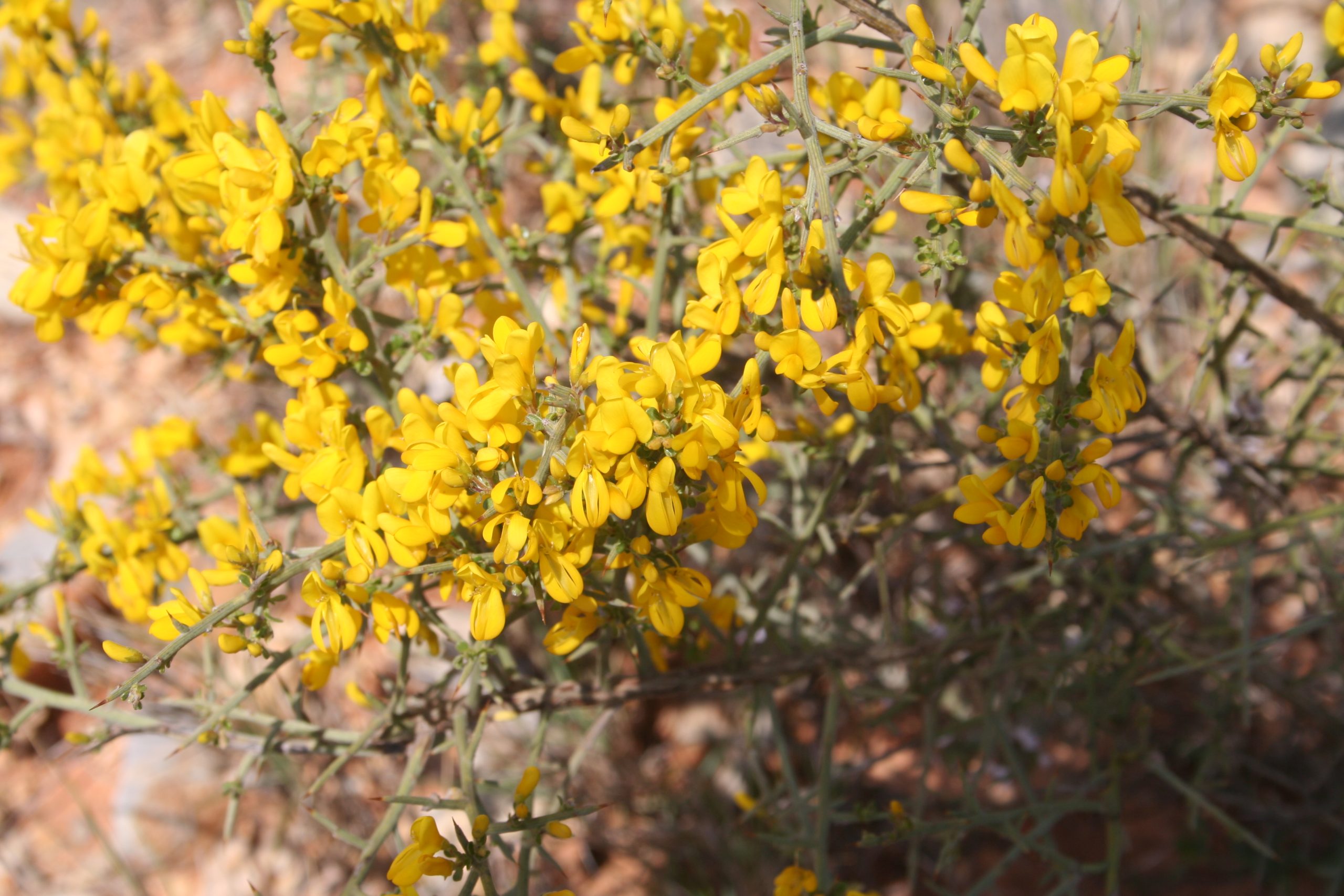Spiny, dense shrub, 1–2 m high. Twisted branches with short curved spines. Leaves small, trifoliate, often deciduous. Flowers in spring, bright yellow in dense clusters typical of Fabaceae. Hardy, adapted to poor, dry, rocky soils; compact, spiny form protects from grazing.