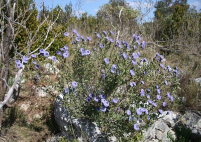 Petit arbuste sempervirent de moins d’un mètre avec de nombreuses tiges dressées. Feuilles coriaces, oblongues avec nervure centrale, assez espacées et persistantes. Floraison de janvier à mars avec inflorescences bleues odorantes de 15–20 mm aux extrémités des tiges.