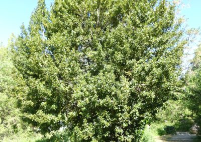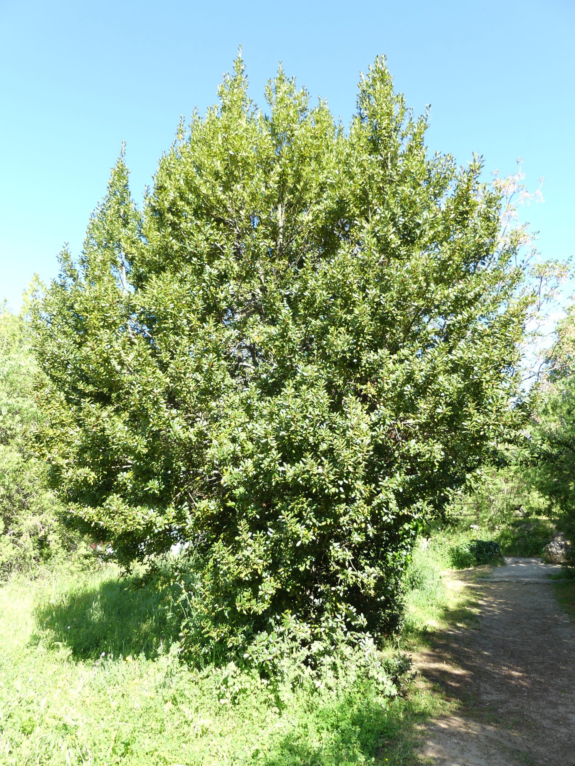 Evergreen shrub or small tree up to 10 m. Lanceolate, leathery, dark green, glossy, aromatic leaves. Smooth gray bark. Flowers in spring, small yellowish in umbels; dioecious species. Fruit a small black ovoid drupe. Typical of Mediterranean maquis, drought-resistant, grows on well-drained soils. Cultivated for ornamental and culinary use.