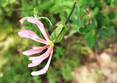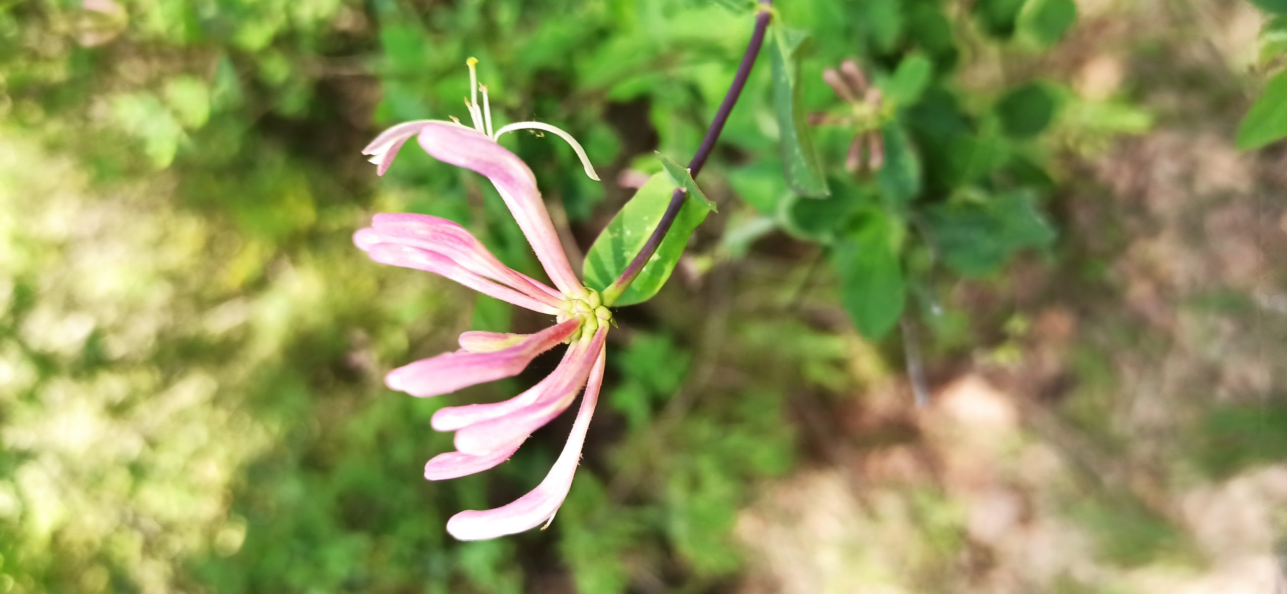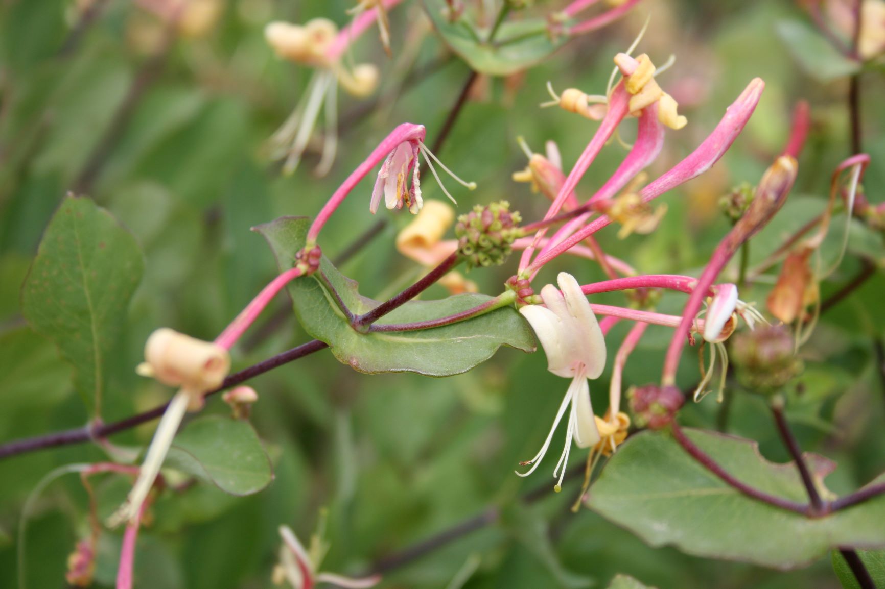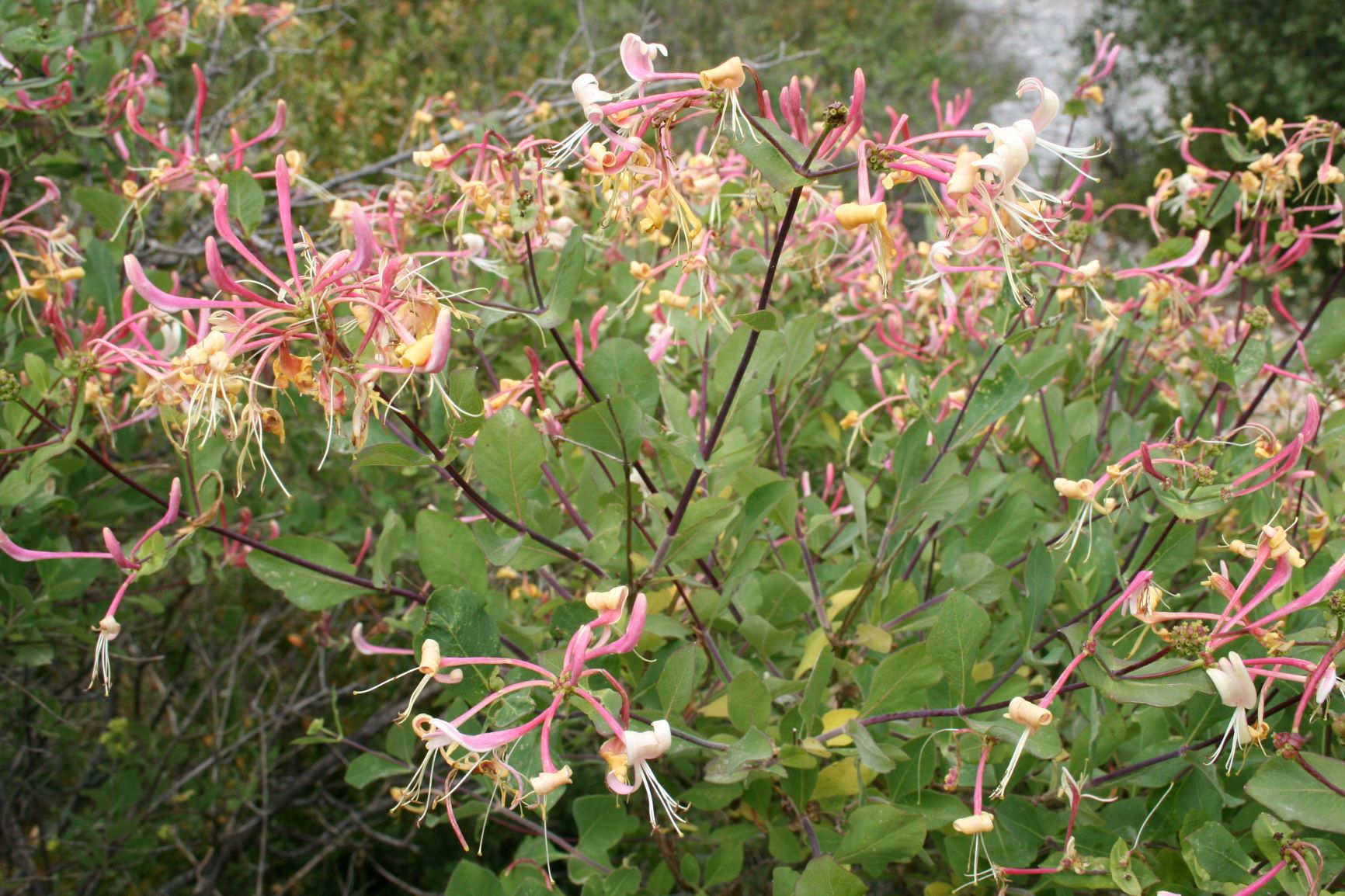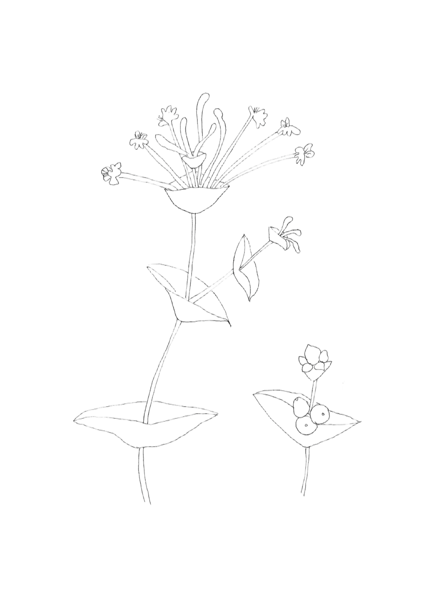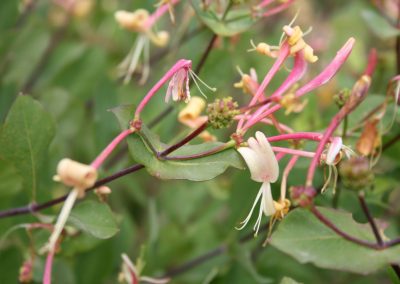 Climbing subshrub 1–3 m with twining stems, glabrous or pubescent. Deciduous, obovate leaves; upper leaves sometimes connate. Highly fragrant flowers yellowish-white inside, reddish outside, in terminal whorls with long peduncles. Calyx with subacute teeth; glabrous corolla tube longer than lobes. Fruits ovoid red berries.