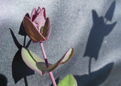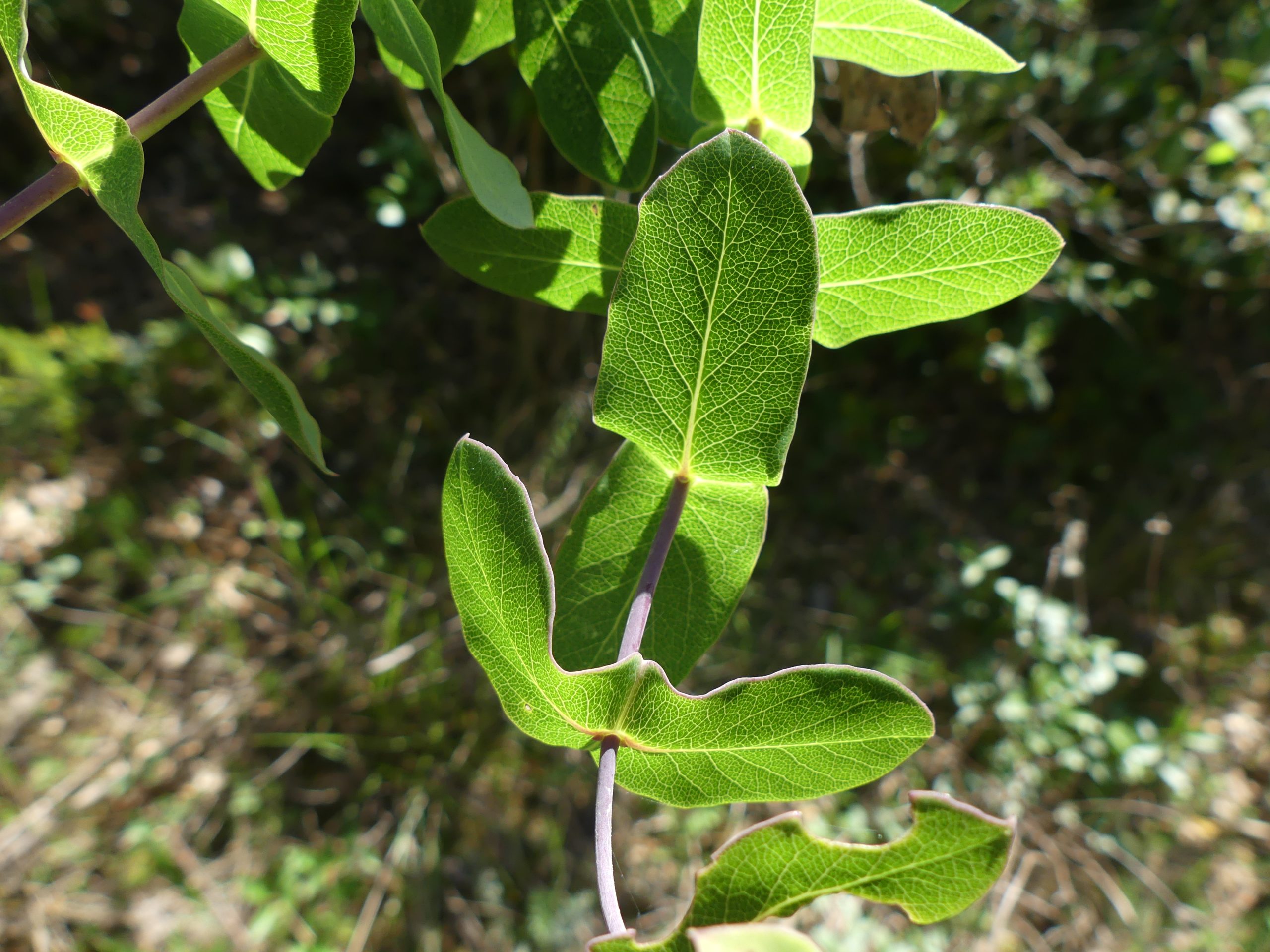 Climbing vine or scrambling shrub 2–4 m long. Leaves oval to rounded, often opposite; upper leaves fused at the base. Flowers in terminal clusters, tubular, cream to pink-purple, highly fragrant, blooming spring and summer. Attracts pollinators, especially butterflies. Fruits small red berries, not edible. Common in Mediterranean maquis and hedgerows, twining around supports without tendrils.