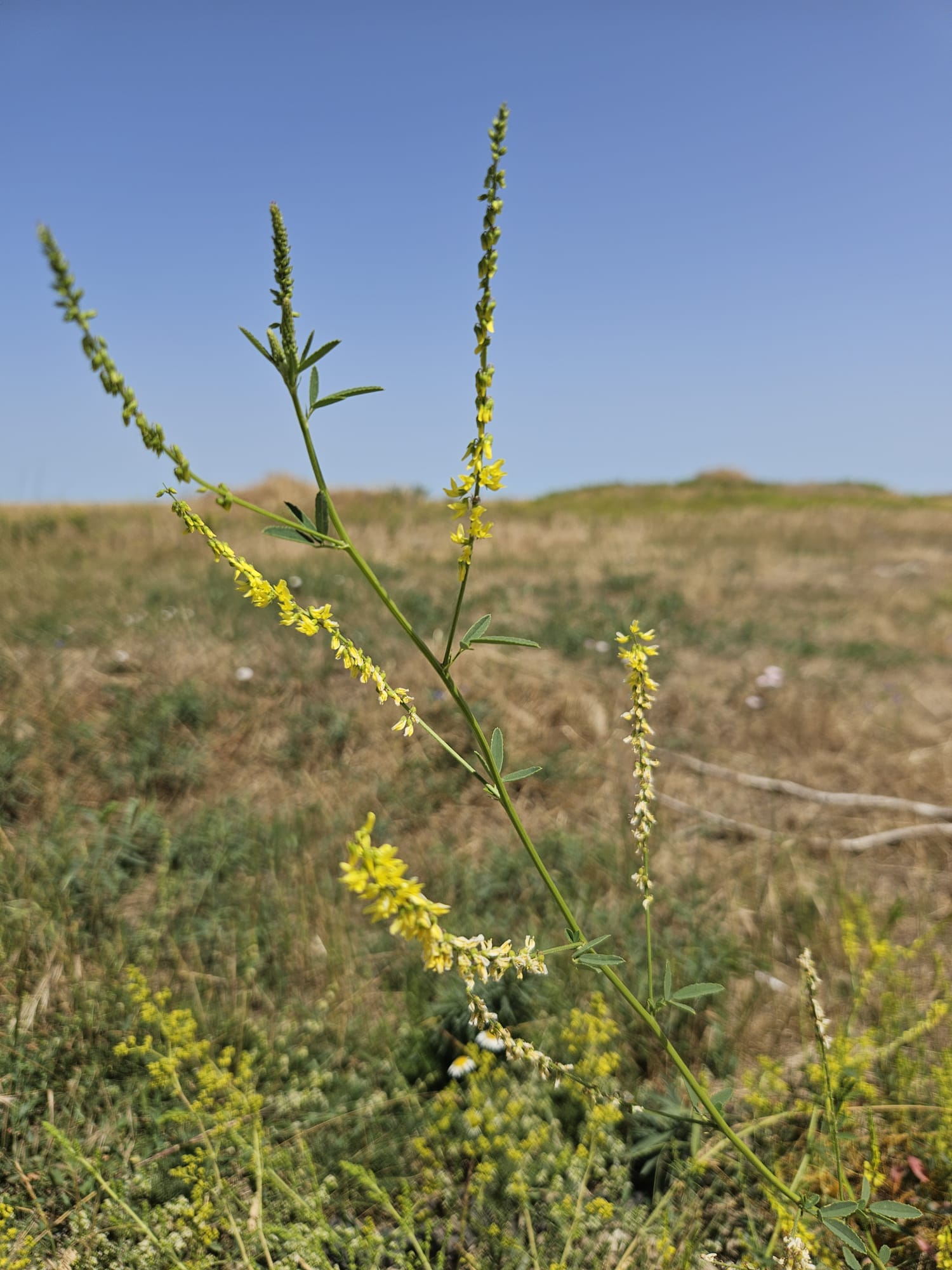 Herbaceous perennial. Taprooted, branched root with nitrogen-fixing nodules. Stem tall, cylindrical, glabrous, up to 2.5 m, much branched. Leaves trifoliate, petiolate, with lanceolate or obovate leaflets, short petiolate, toothed margins, narrow and long stipules. Flowers yellow, numerous (30–70), papilionate, fragrant, in racemes up to 10 cm long, opening from base to tip. Flower: five united sepals, five petals of different lengths (laterals longer than the upper), androecium of 10 stamens (9 united), gynoecium with pubescent ovary. Blooms June–September. Fruit: small indehiscent brown–blackish pod with one seed.