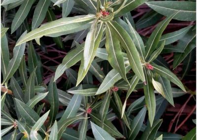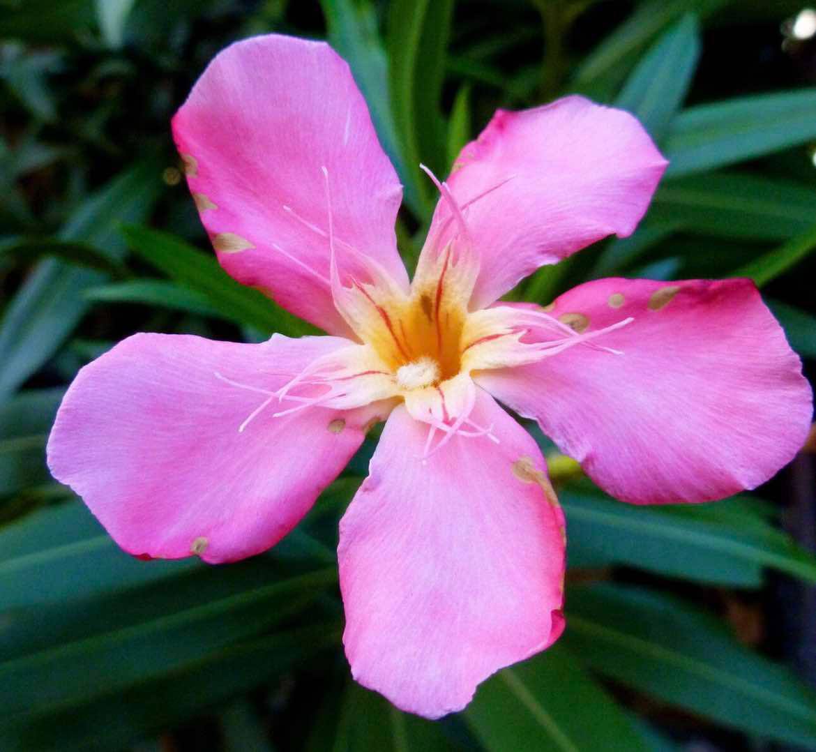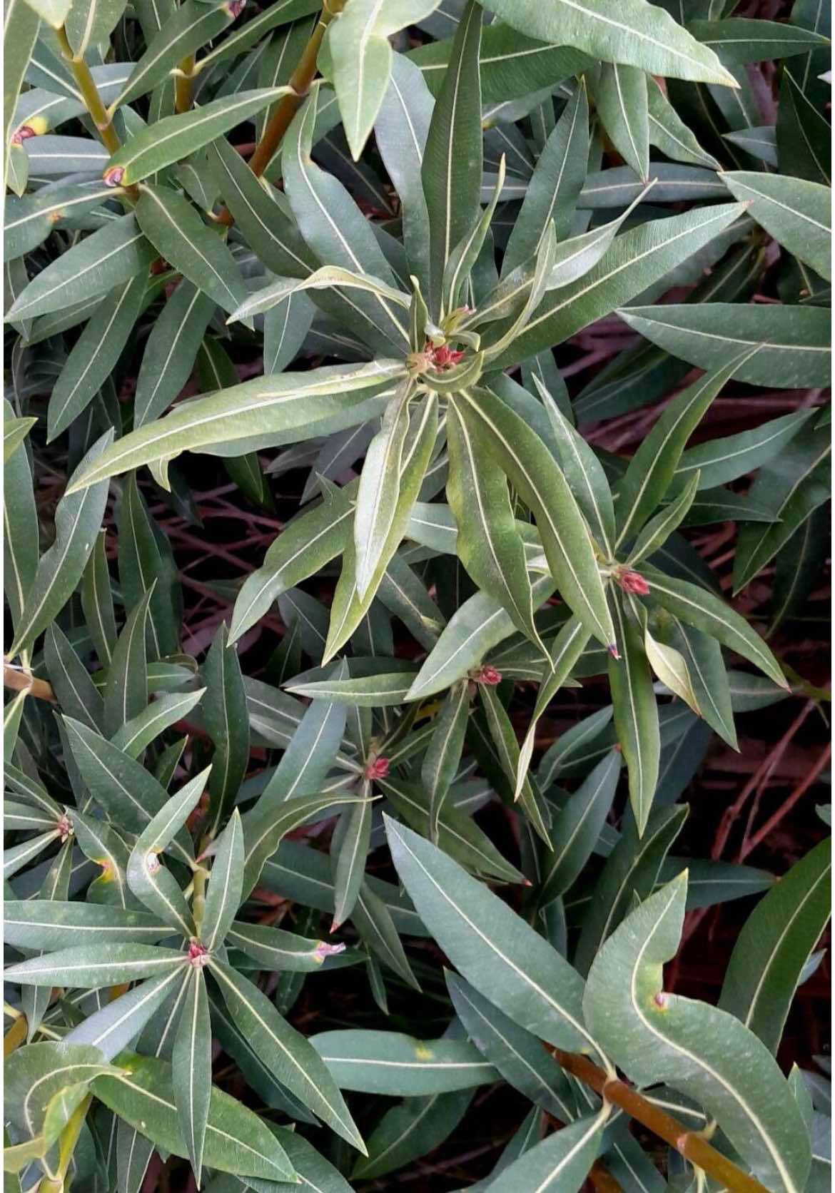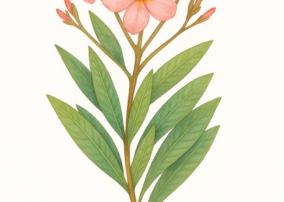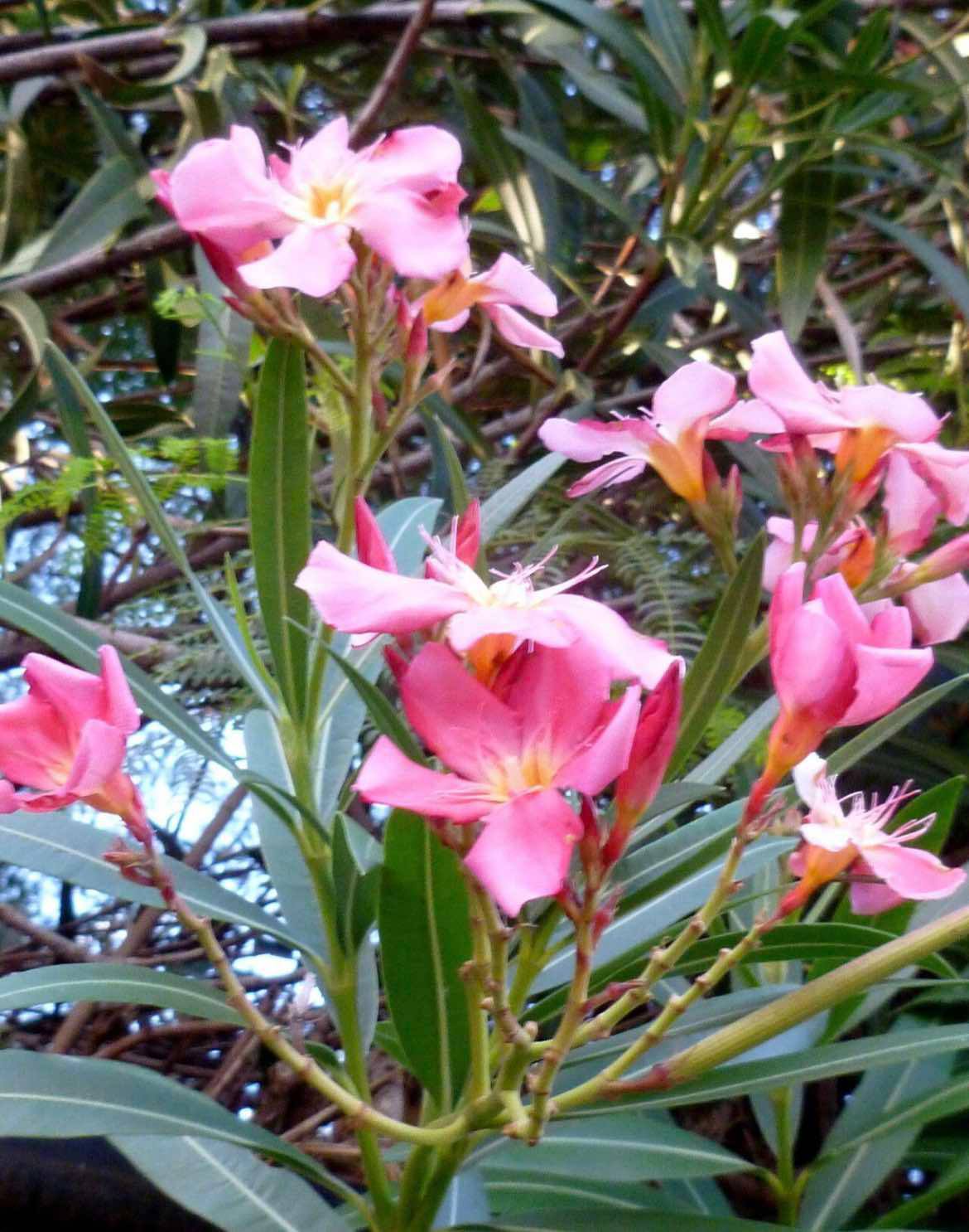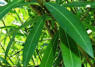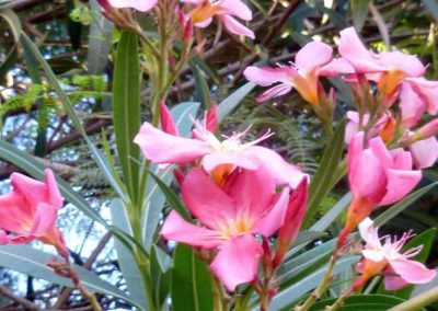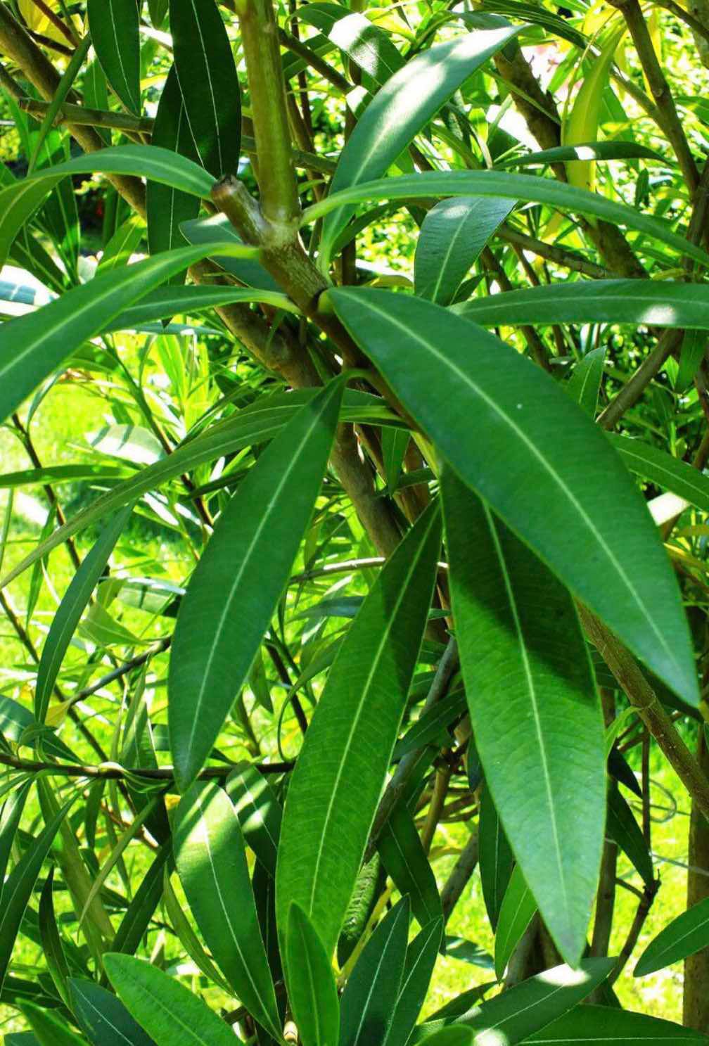 Evergreen shrub up to 5 m, with toxic parts. Lanceolate, leathery leaves; single pink-red flowers. Cultivated varieties may have white, yellow, purple, or double flowers. Toxicity is due to nerine, protecting the plant from animals.
