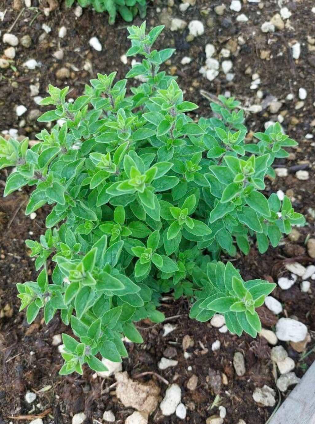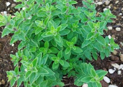 Description: Herbe vivace tendre (souvent annuelle dans climats froids), 20–60 cm, tiges ligneuses à la base, feuilles gris-vert ovales et aromatiques, petites fleurs blanc à rose pâle en têtes noueuses. Arôme doux, chaud, légèrement épicé.