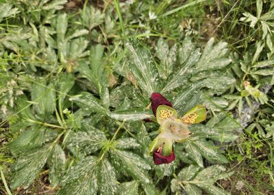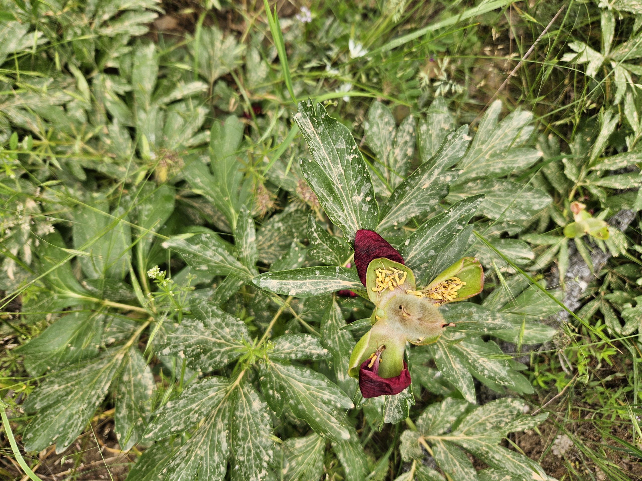 Perennial, herbaceous, endemic plant, 70–90 cm. Roots fibrous, fasciculate, ending in oblong-elliptic tubers. Stem glabrous, erect, cylindrical, slightly branched. Leaves pubescent, long-petiolate, dissected to base. Flowers large, blood-red, on top of glabrous peduncles, solitary, with yellow stamens. Blooms late spring–early summer.
