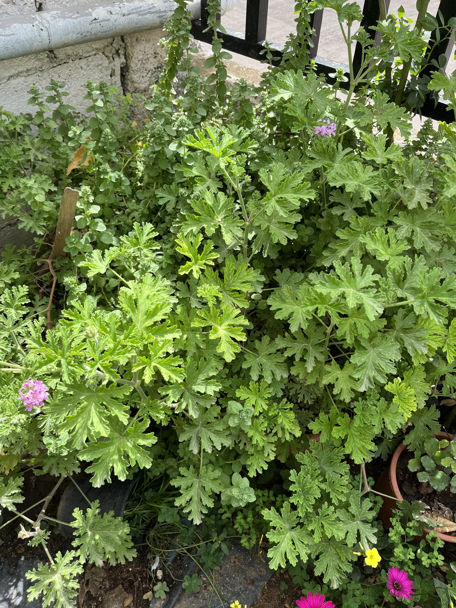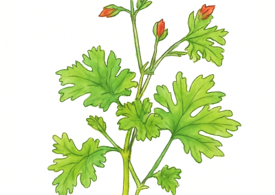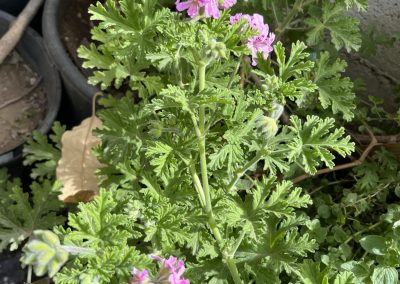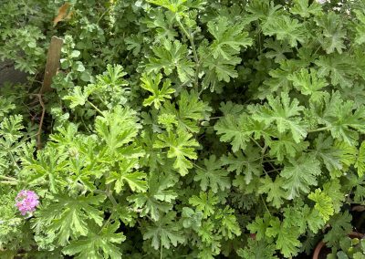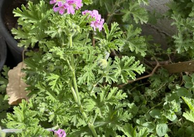Description: Perennial herbaceous plant with tender non-woody stems. Fast-growing. Leaves grey-green, serrated, fuzzy, large, strongly aromatic when rubbed. Flowers in umbel-type inflorescences with 5 petals, pink to purple shades.