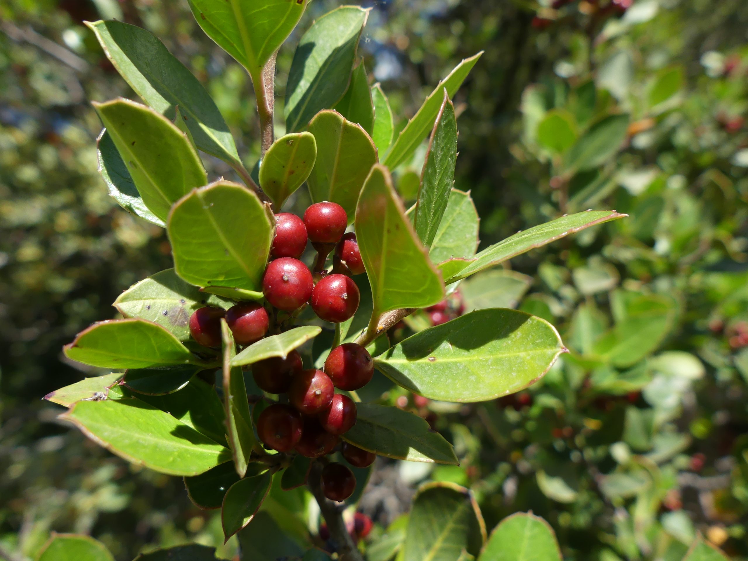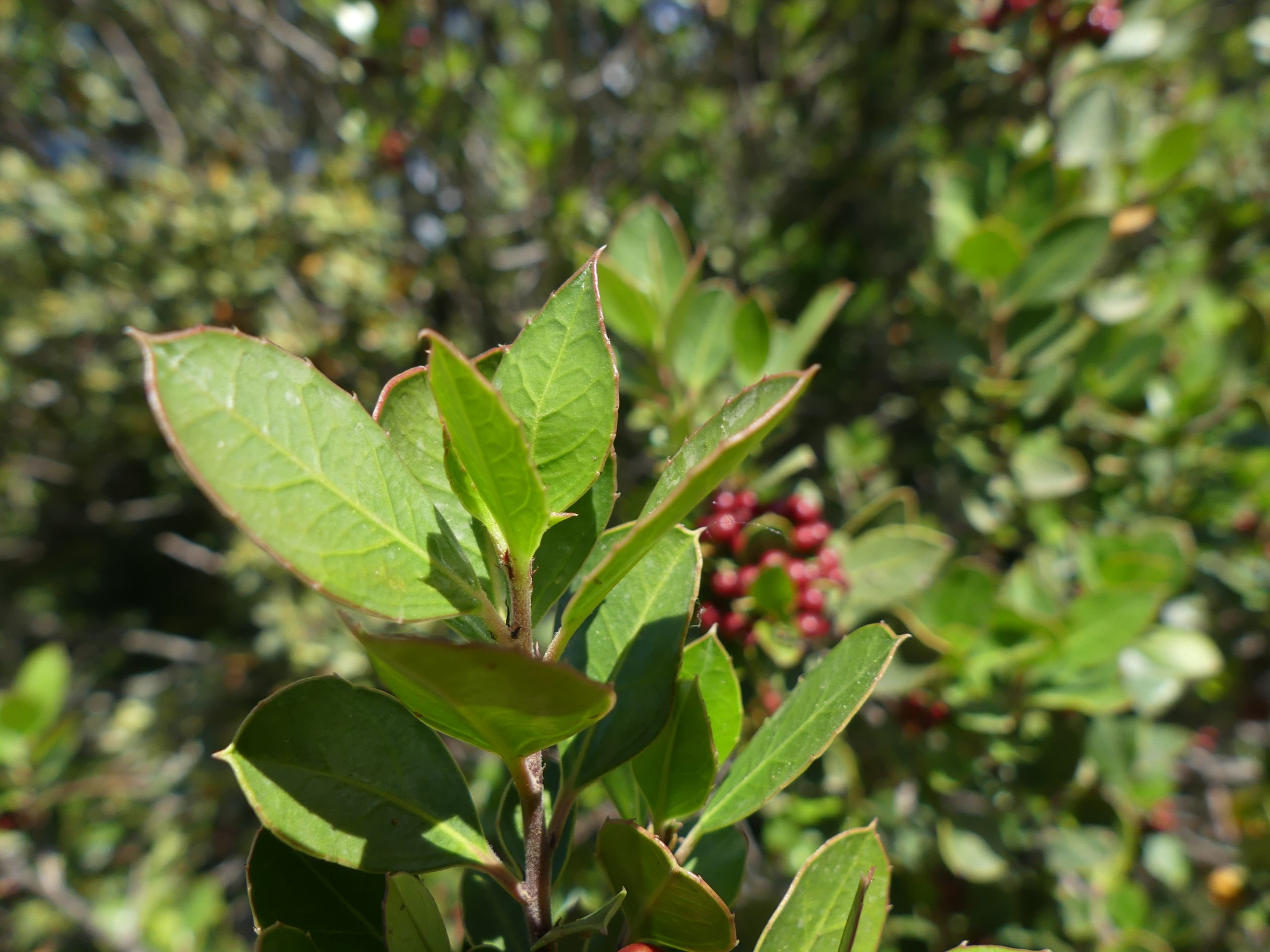 Evergreen shrub up to 4 m tall. Leaves oval to lance-shaped, thick, finely toothed margins, prominent central vein. Small greenish flowers bloom March–May at leaf bases. Fruit is a small black berry (5–7 mm), ripening in autumn.