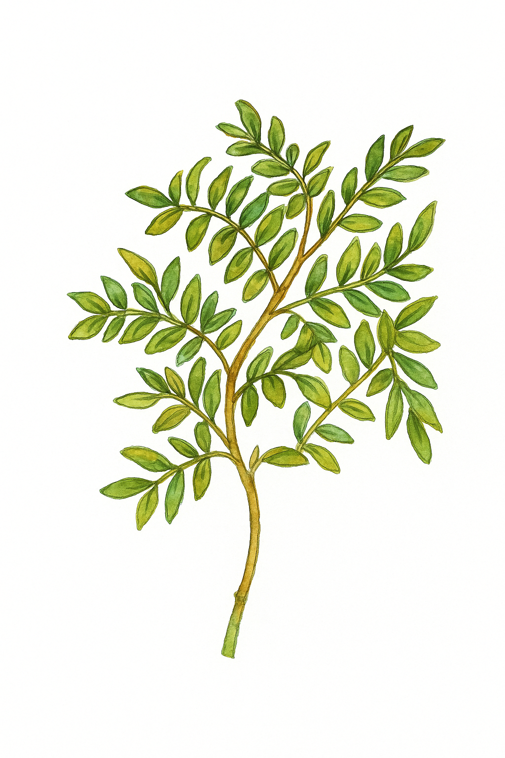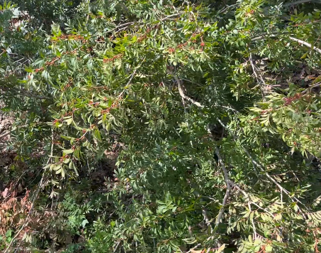 Evergreen shrub/tree, width 6–9 m. Dense attractive foliage with small green leaflets, leathery texture, aromatic. Leaves compound, alternate, pinnate, lanceolate, sessile, deep green. Male and female flowers on separate plants; decorative fruits, pale red-pink turning glossy black.