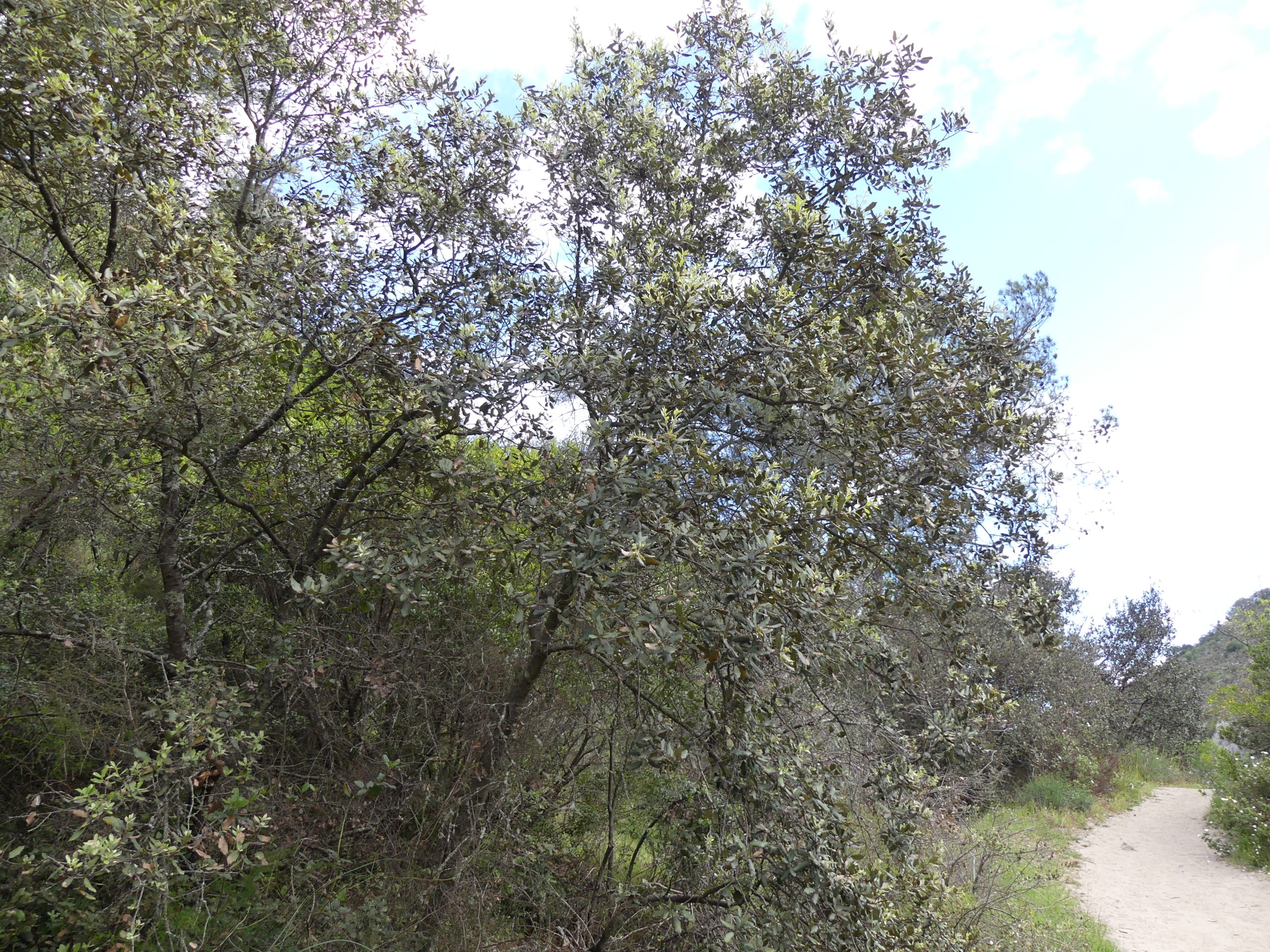 Evergreen tree or shrub, 2–15 m (sometimes up to 25 m). Bark grey, slightly fissured. Leaves oval to lanceolate, entire or spiny-edged, dark green above, whitish and downy beneath. Flowers bloom April–May.