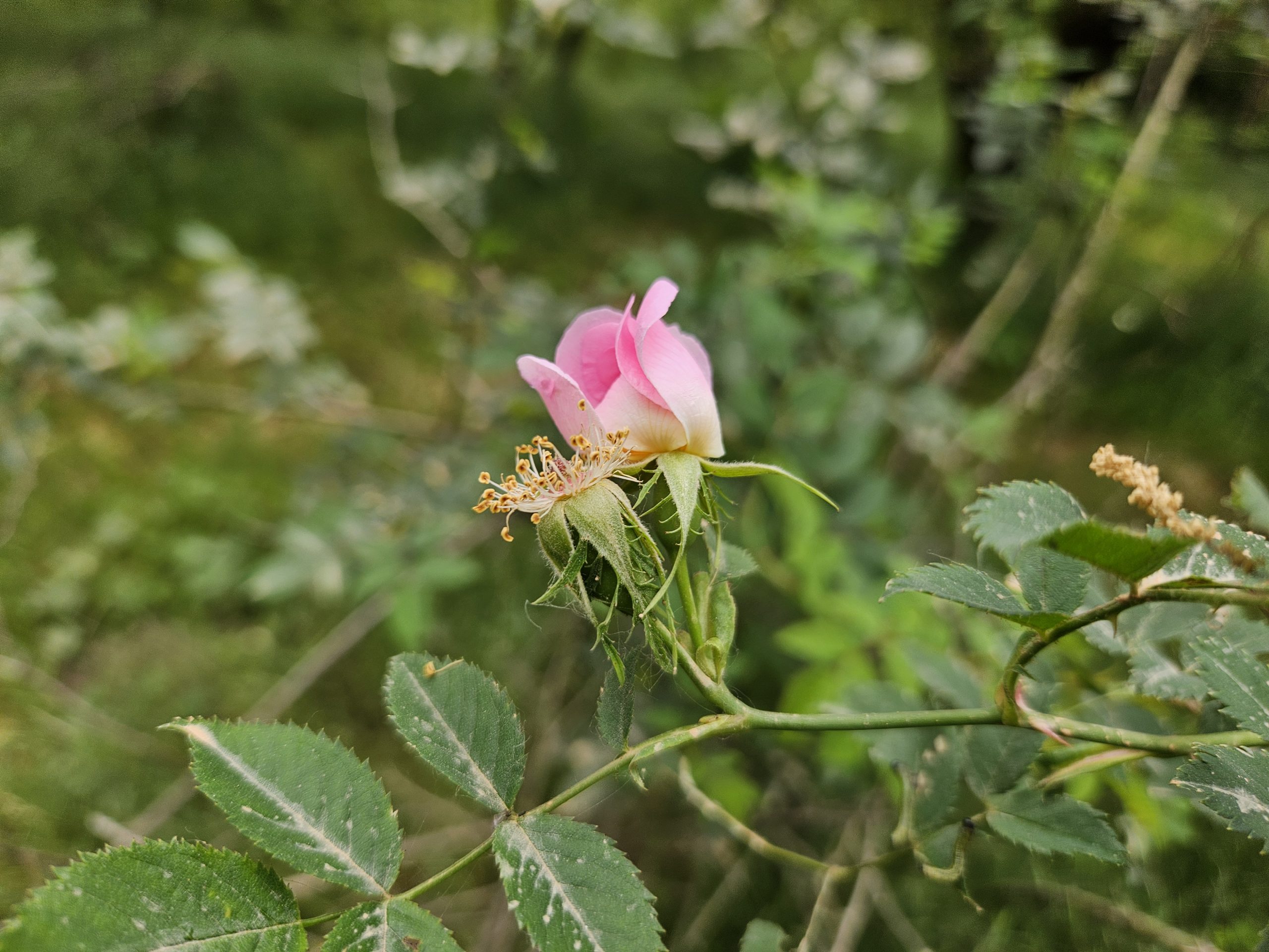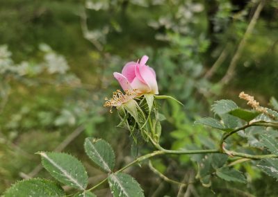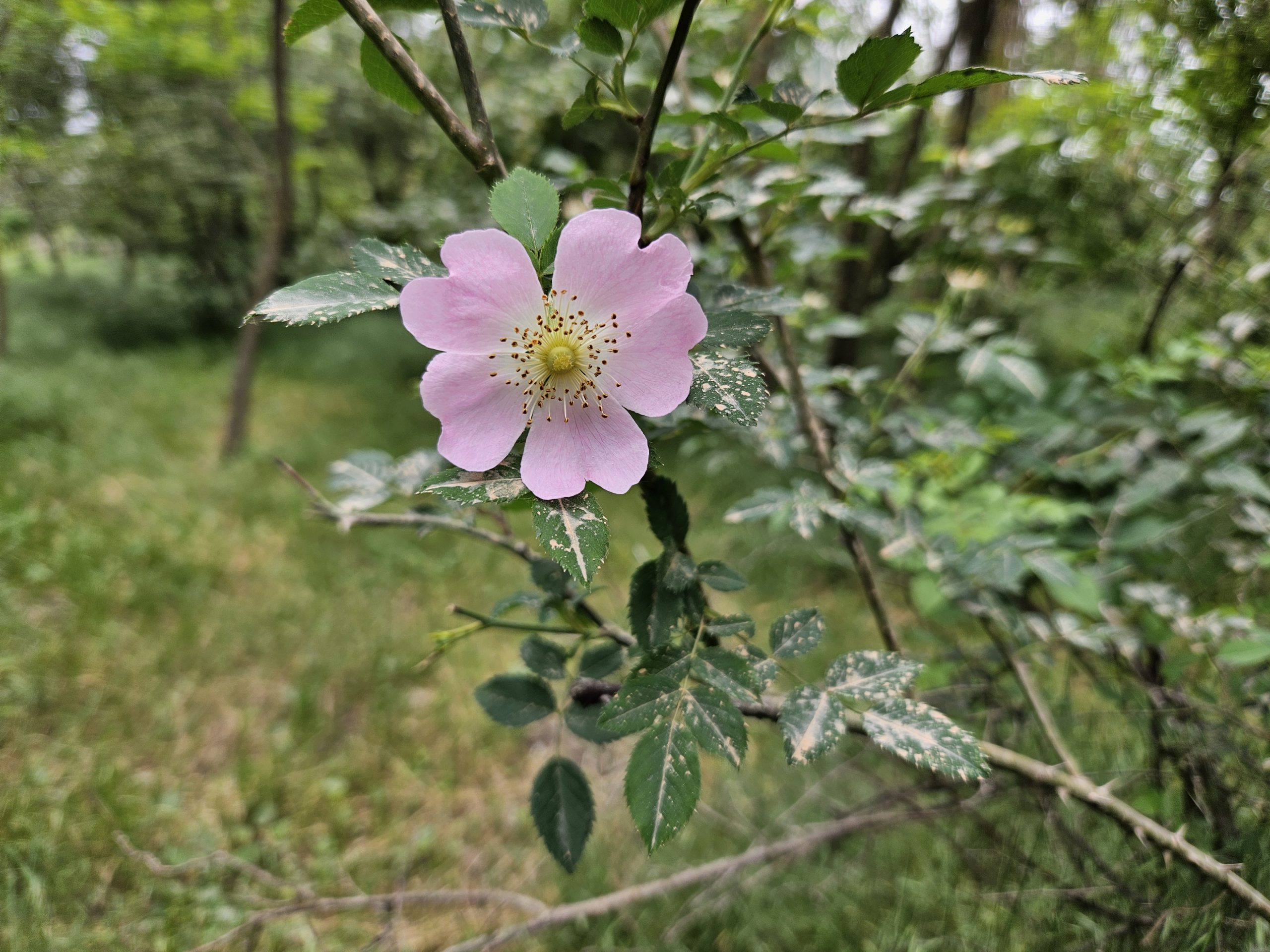 Thorny shrub 2–5 m high, stiff thorns, slender at base, recurved at tip. Stems elongated, branched, outward curved or pendulous. Leaves pinnately compound, stipules concentric with petiole. Flowers solitary, pinkish-white, fragrant. Receptacle cup-like, calyx 5 sepals (3 pinnately fused, 2 entire), corolla 5 free petals. Androecium numerous stamens, gynoecium numerous free hairy carpels. Fruit an achene enclosed in fleshy receptacle, forming false multiple red fruit, edible.