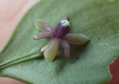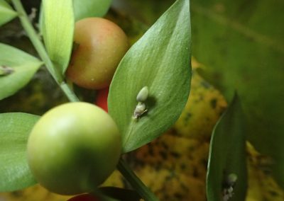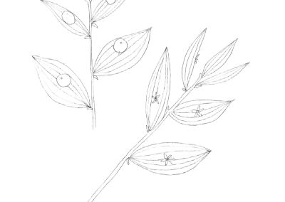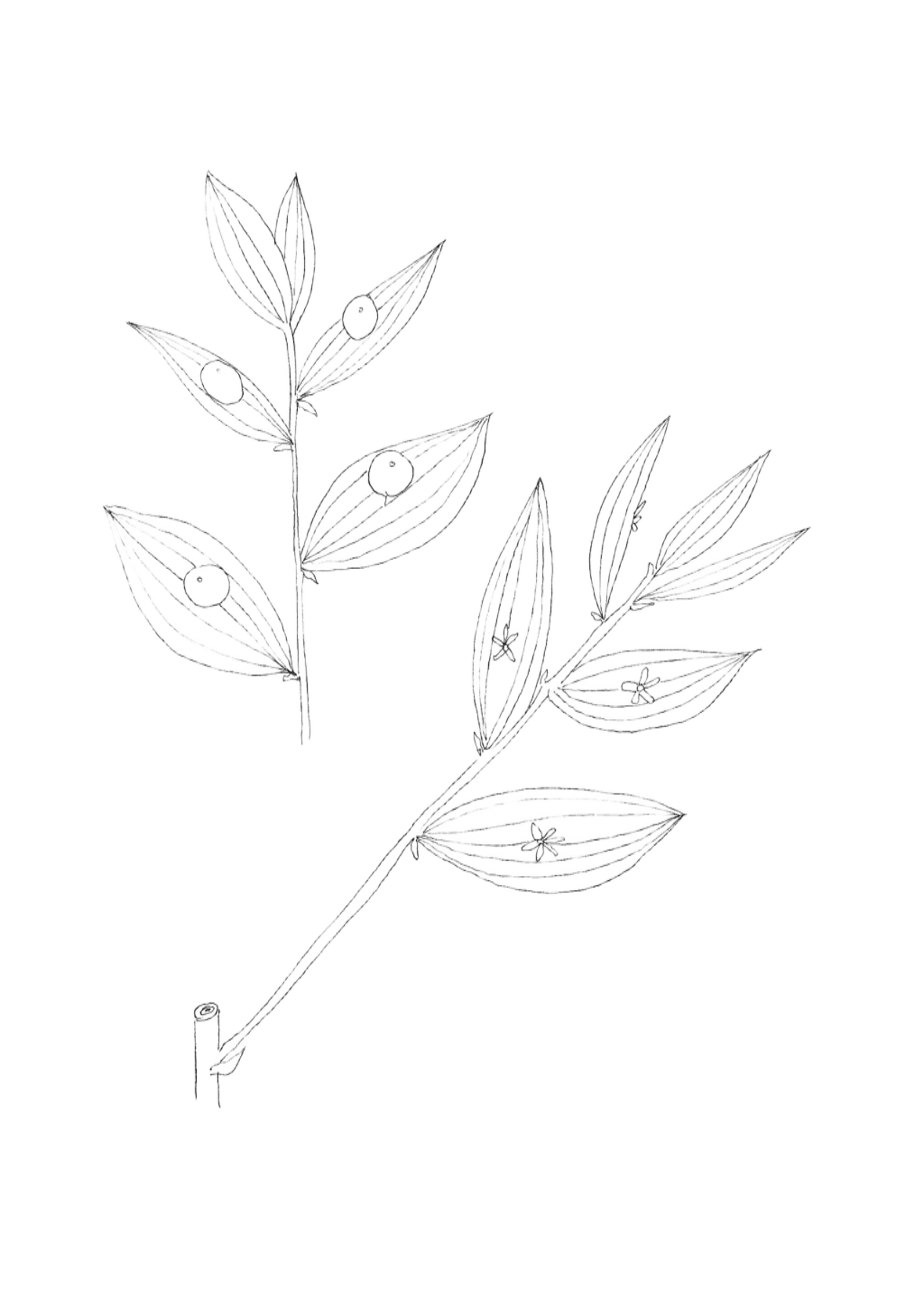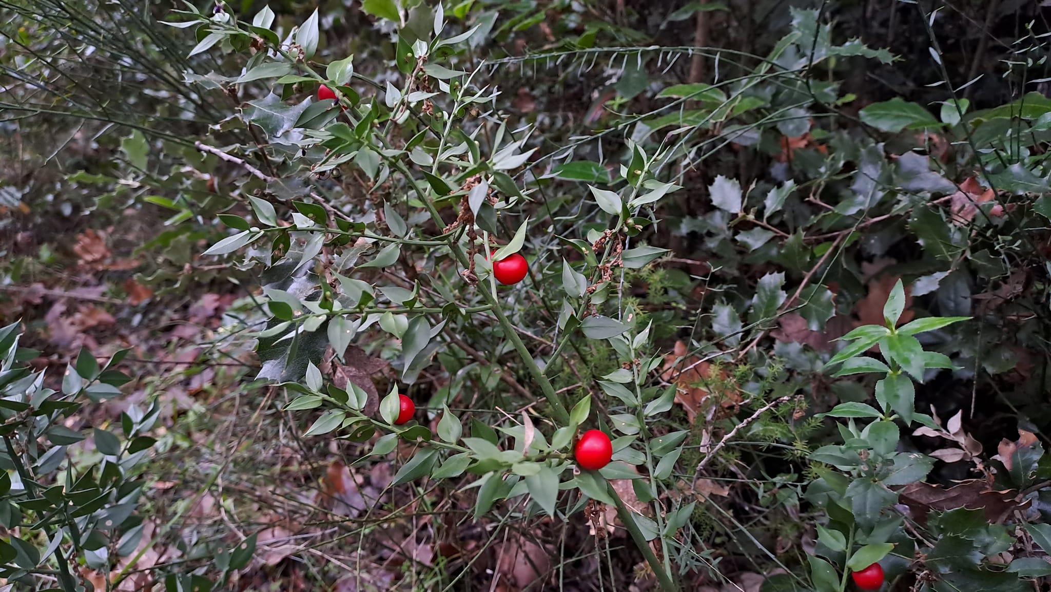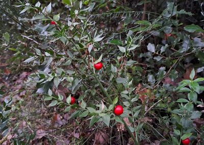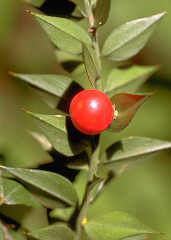 Small perennial shrub, evergreen, 30–60 cm tall. True leaves reduced and replaced by spiny, rigid, flat cladodes (false leaves). Small greenish flowers in axils of cladodes. Bright red berries visible in autumn and winter. Grows in shaded, cool understories, calcareous or moist soils, forest edges, and Mediterranean hedgerows.