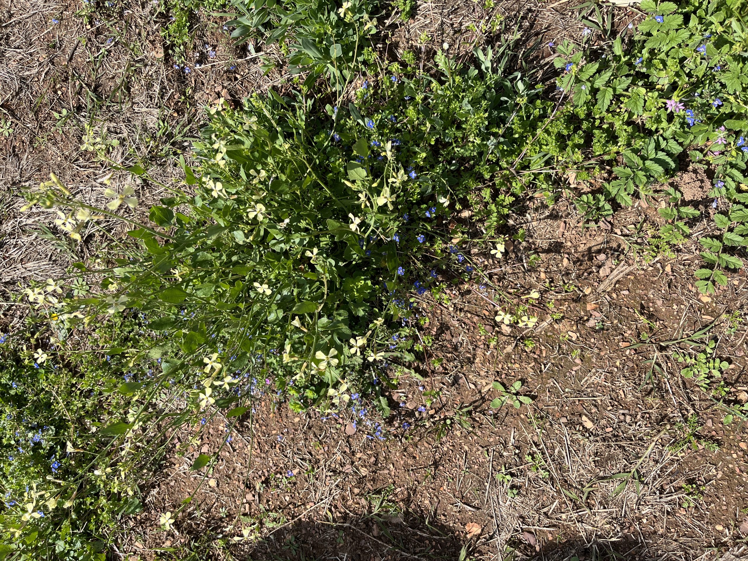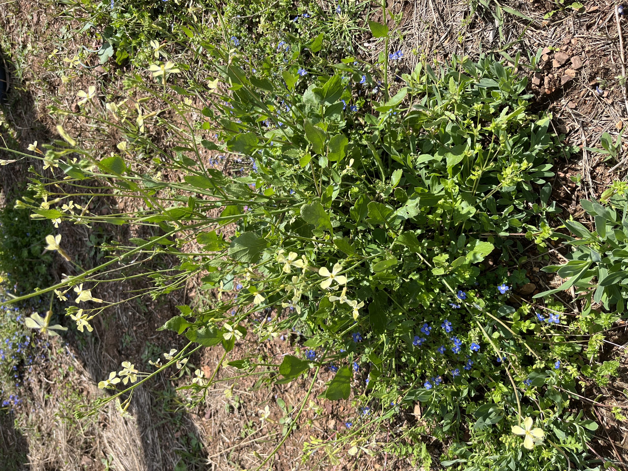 Four bright yellow petals over mid-green leaves. Stems with downward-pointing white hairs and red segments at joints. Seedlings have spiny leaves with prominent veins. Basal rosette growth. Lower leaves lobed and toothed, upper leaves alternate, sessile to short-stalked, becoming shorter up the stem. Flowers ~1 cm, cross-shaped arrangement.