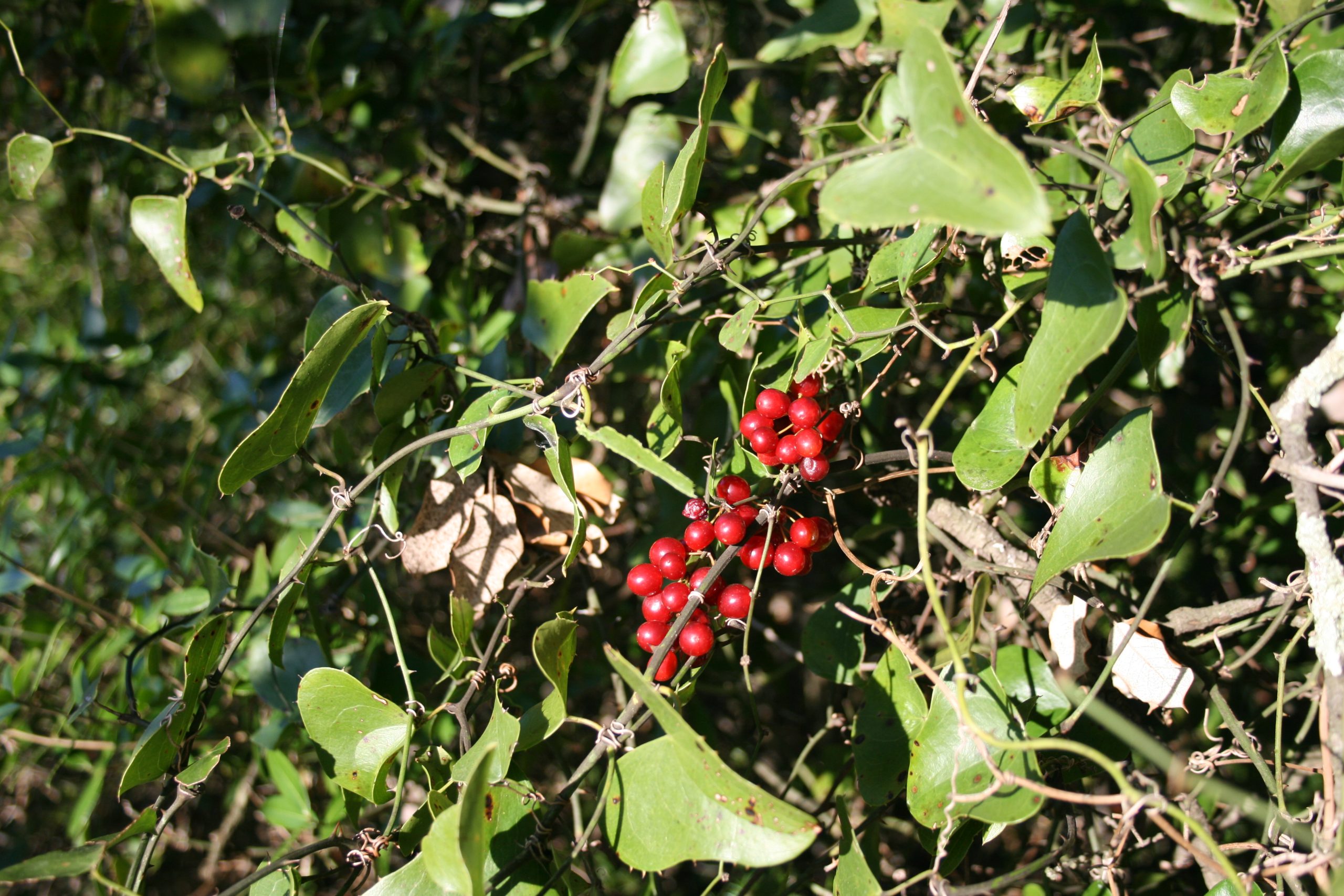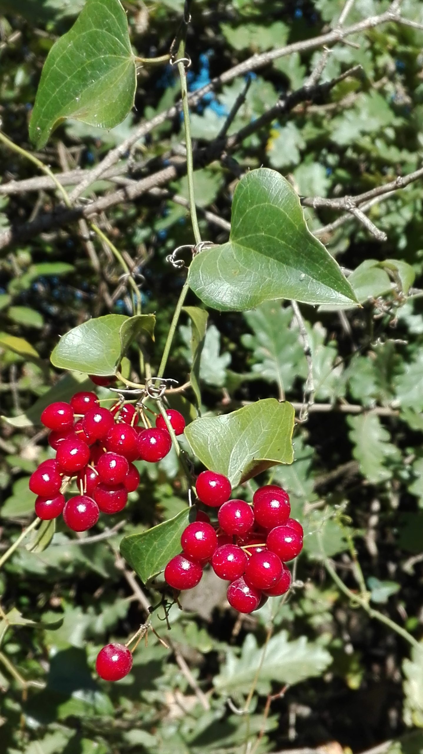 Αναρριχώμενος θάμνος με λεπτούς, αγκαθωτούς βλαστούς. Φύλλα καρδιόσχημα, σκληρά, γυαλιστερά, με αγκάθια στα άκρα. Απλοί έλικες. Κίτρινο-πράσινα άνθη σε σπονδύλους, Αύγουστος–Οκτώβριος. Κόκκινες ράγες μετά την ανθοφορία.