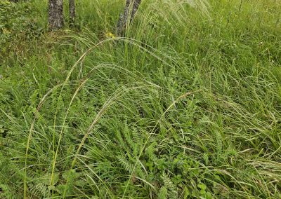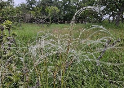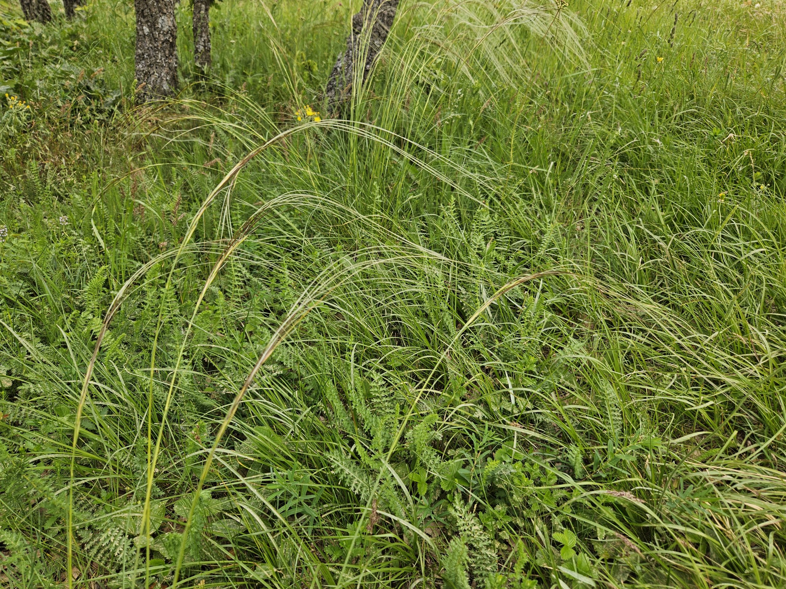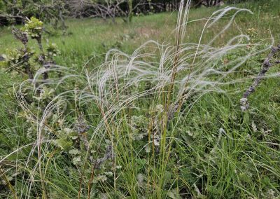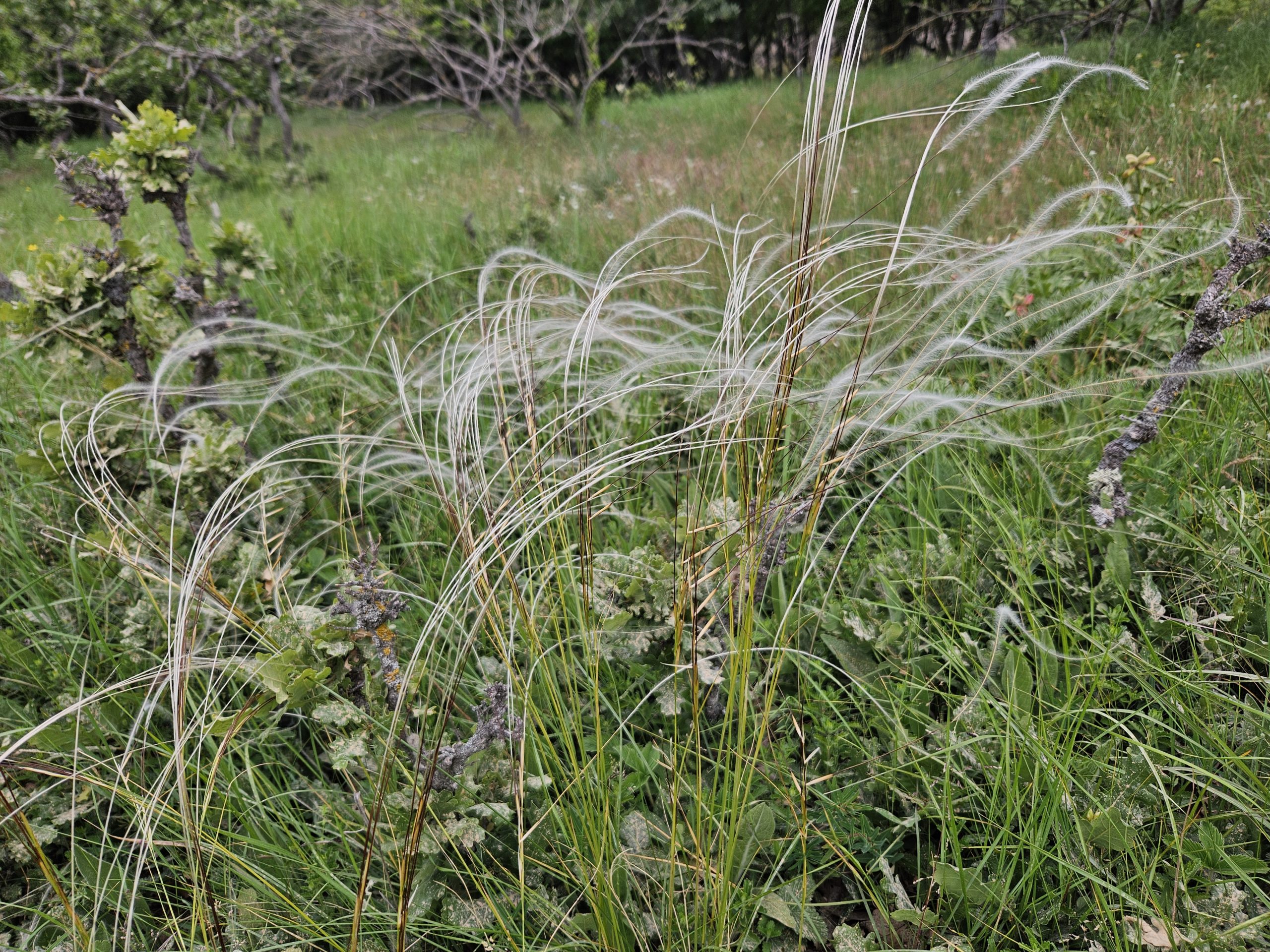Vigorous, perennial, herbaceous plant forming dense tufts. Deep taproot; stems 50–100 cm tall. Slender, stem-length, green leaves. Uniflorous spikelets arranged in panicles. Lower blade hairy at base; hairy awn up to 35 cm, remaining attached to caryopsis, aiding wind dispersal.